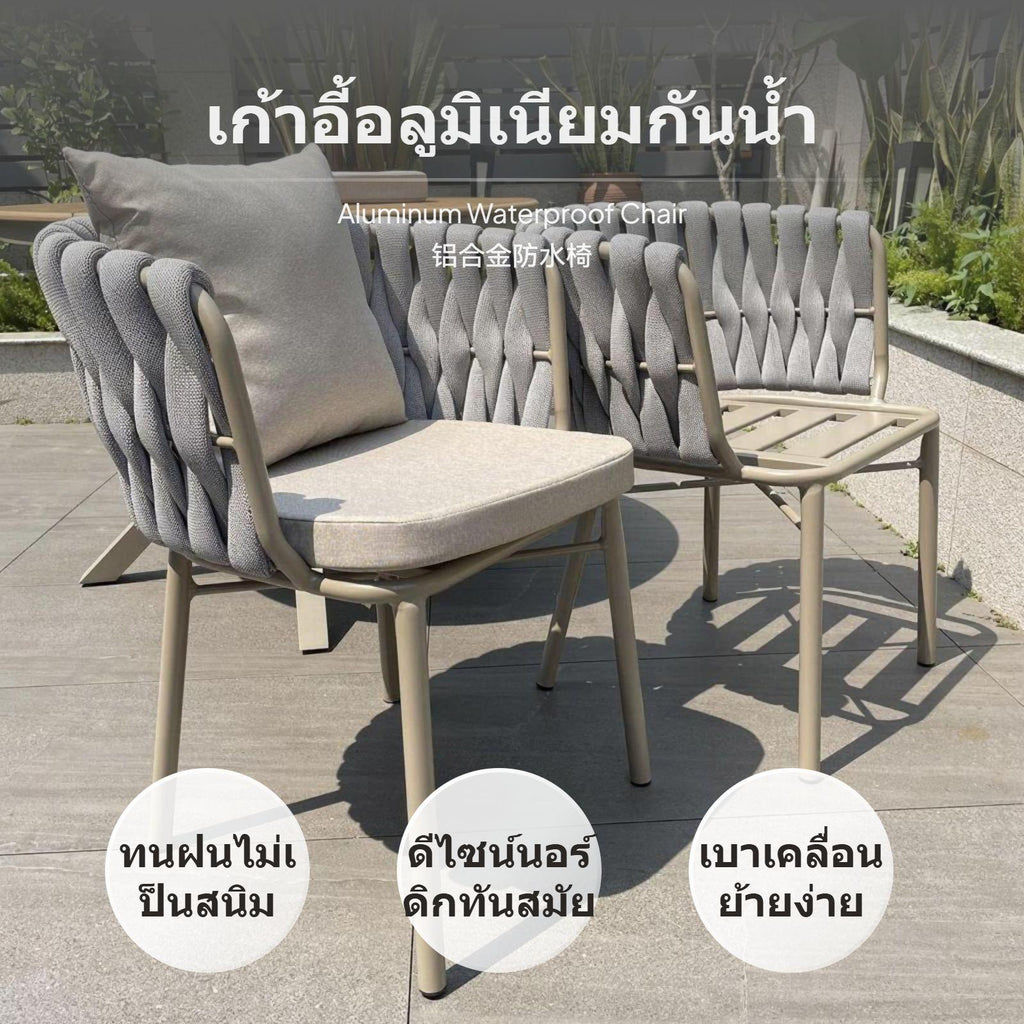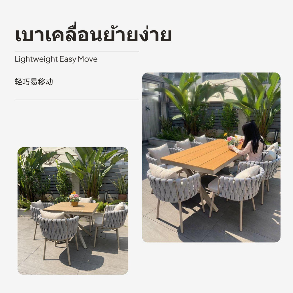 [Stylish Outdoor Nordic Patio Set] Elevate your garden or terrace with this modern table and chairs set featuring clean lines, two-tone color choices, and invigorating Scandinavian atmosphere.[Aluminum Frame and Water-Resistant surface] Enjoy the reinforced aluminum alloy construction paired with a wood-textured plastic surface that resists rust, oxidation, and moisture for enduring outdoor appeal.[Hand-Woven Comfort] Relax with ergonomic woven backrests, thick foam seat cushions, and included lumbar pillows that offer breathable support and comfort for leisure relaxation periods.[Flexible Extendable Table & Multiple Combinations] Choose from various configurations and sizes, including rectangular, square, round, and extendable tables (180cm to 240cm), and customizable combination of chairs and benches for any occasion or group.[perfect for Patio, Balcony, Garden] Perfect for patios, balconies, gardens, and outdoor gatherings; semi-assembled design enables easy setup and adaptable placement for family dinners, parties, or ordinary relaxation.Specification: