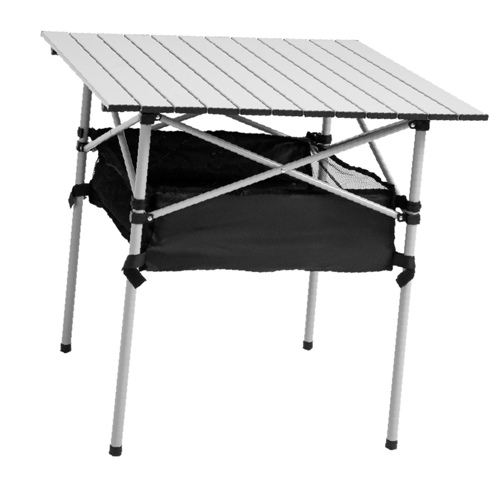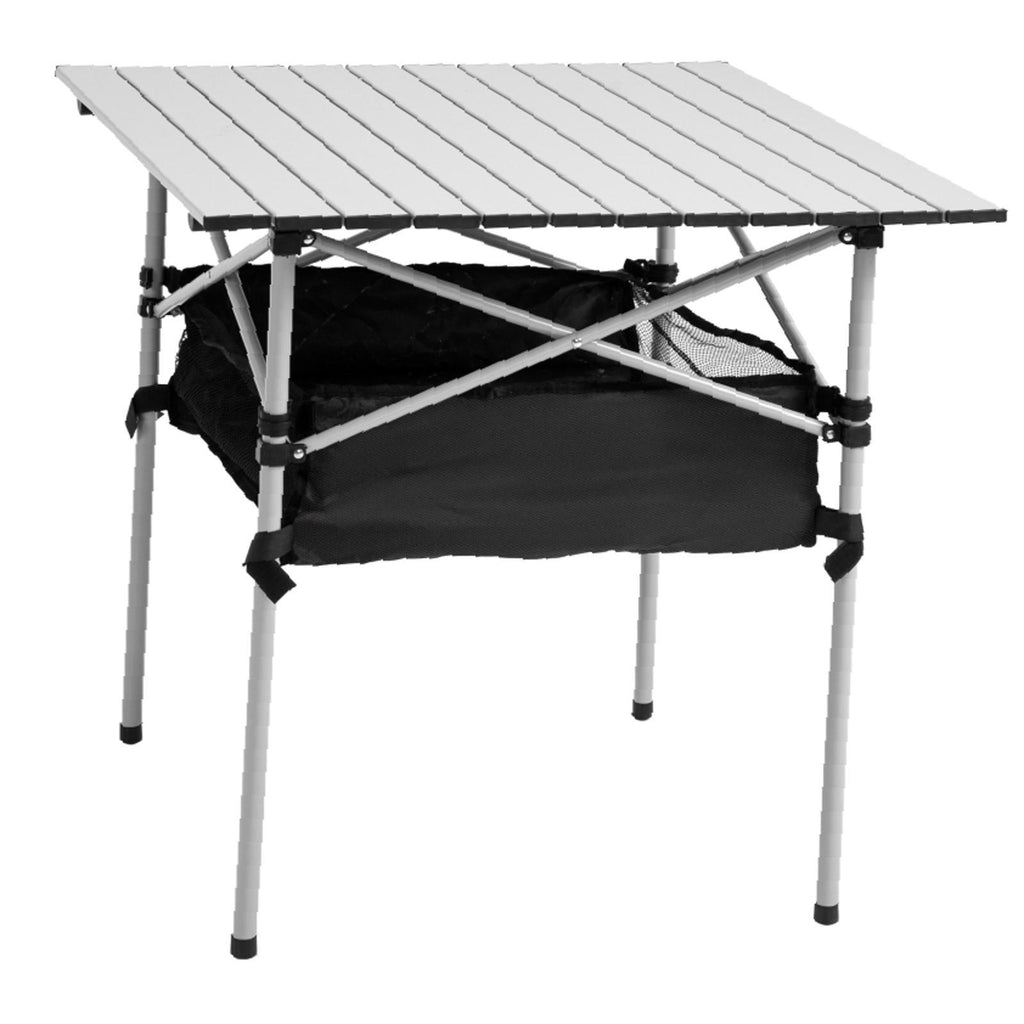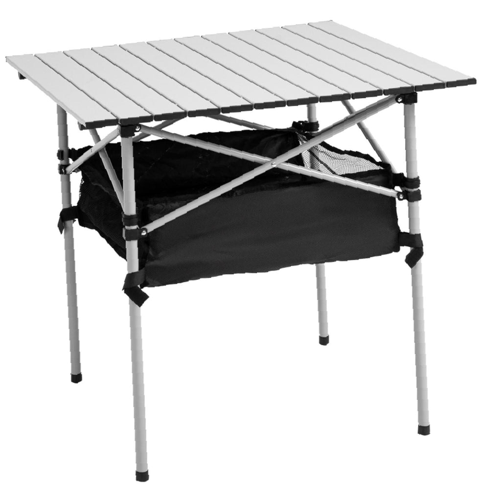 - DESIGN: Combines a camping table and storage bag - you can eat outdoors with all dinnerware next to you. Bag can also be used as a temporary bin.- ROLL-UP ALUMINIUM TOP: Detaches easily and packs away easily. Lightweight so it doesn't weigh you down when carrying. Weather-resistant and easy to clean.