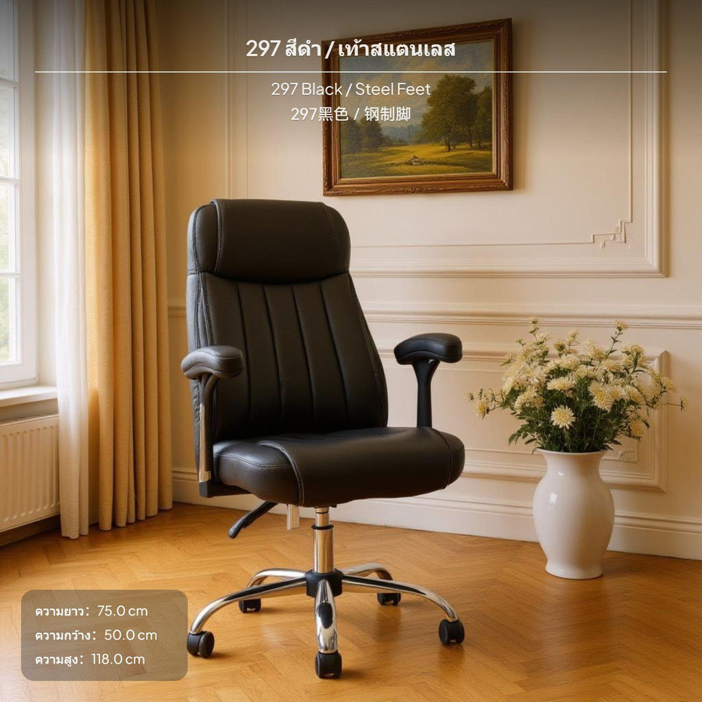 Professional Office Chair, Brown PU Computer Chair, Ergonomic rotating Manager Chair with Fixed Armrests and Adjustable Height, Steel Base, Headrest 297 Black Steel Feet