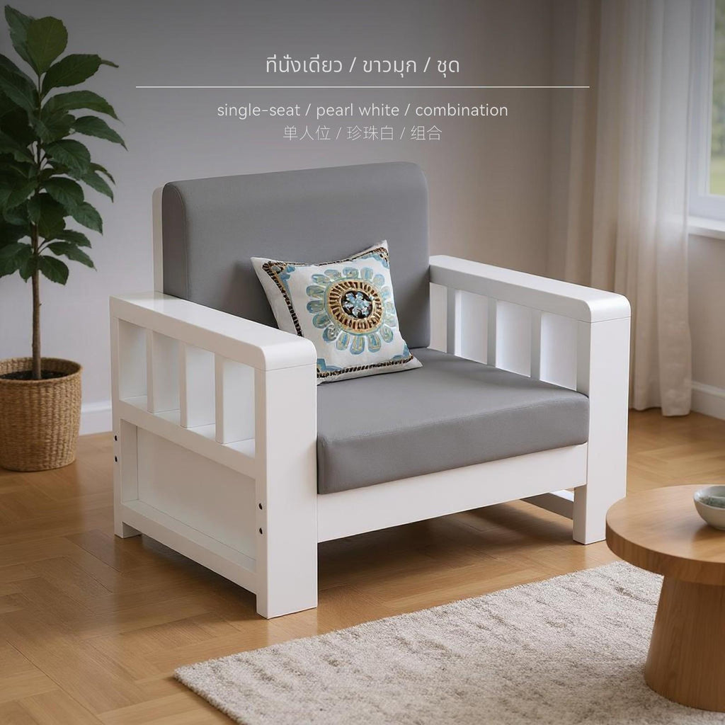 Maxbell Solid Wood Sofa Set for Living Room, Modern Simple Design 1 seat pearl white combo