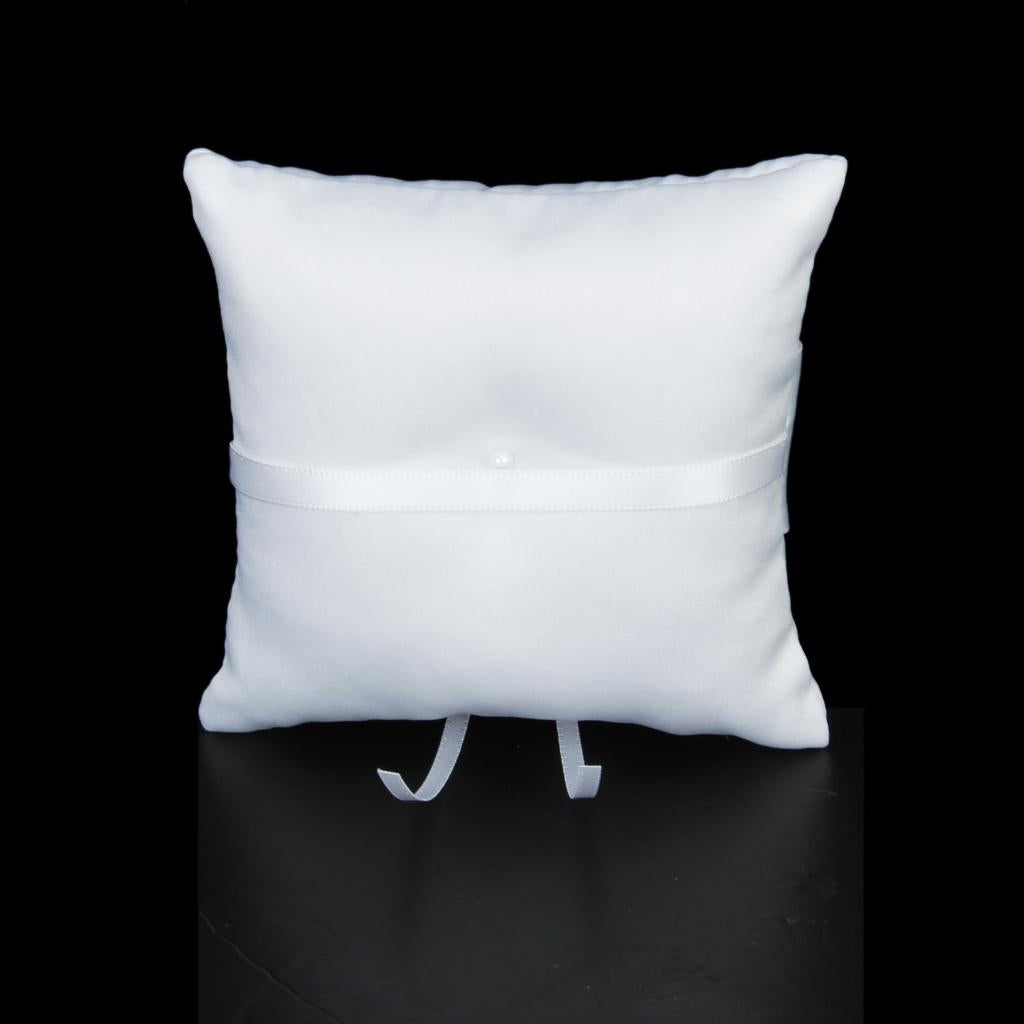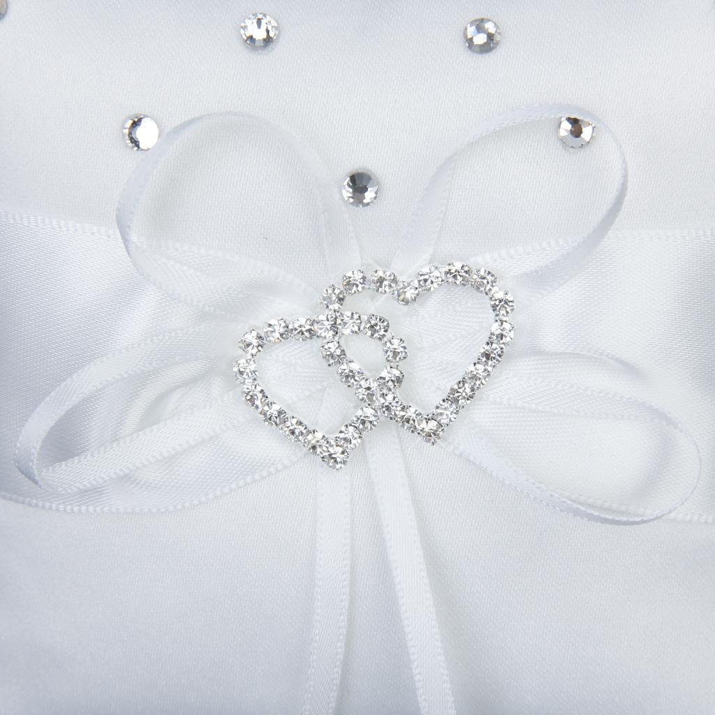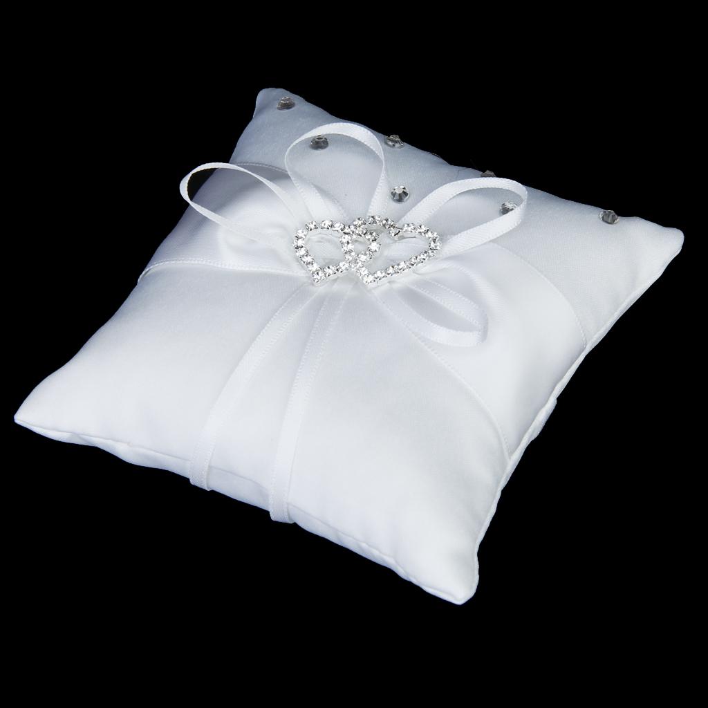 - White ring pillow decorated with satin ribbon and sparking double heart diamante buckle to tie the ring