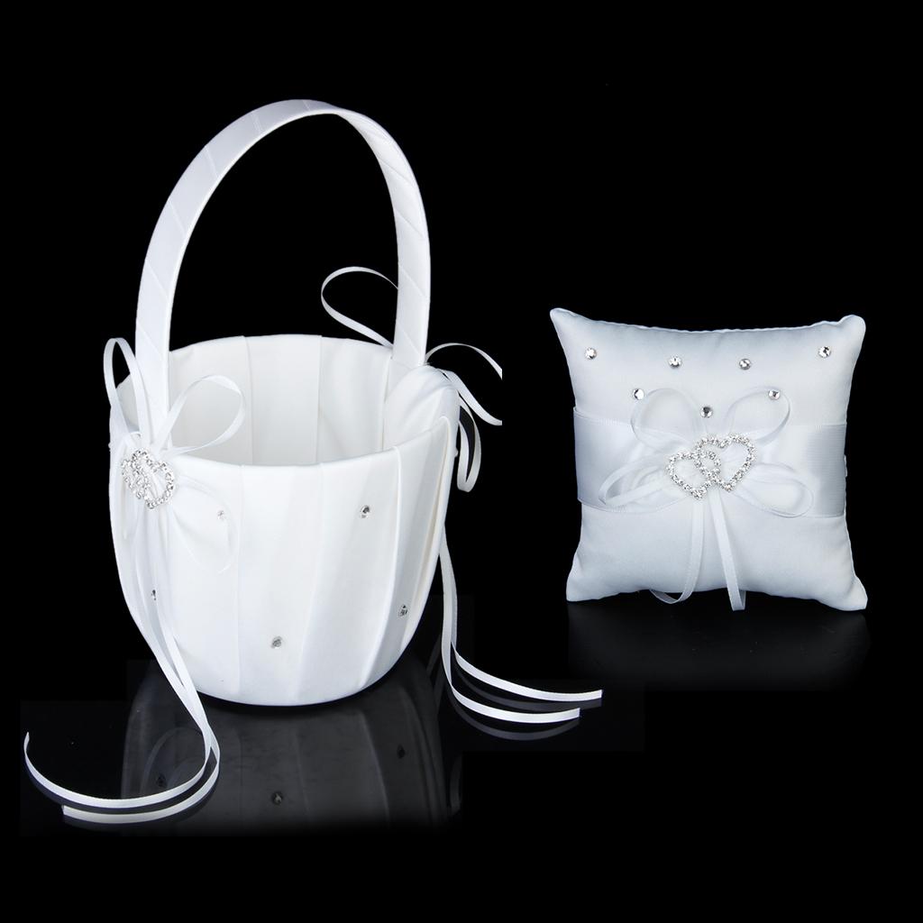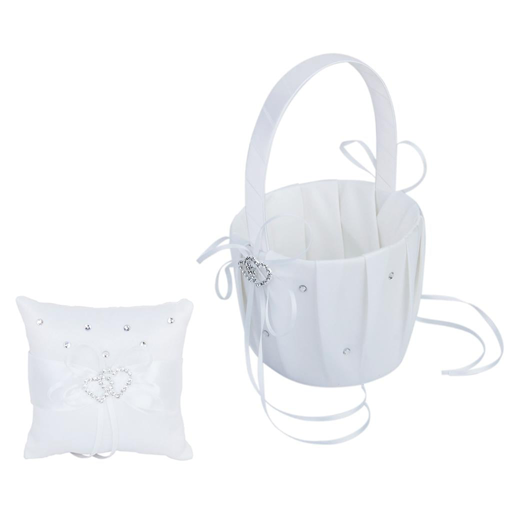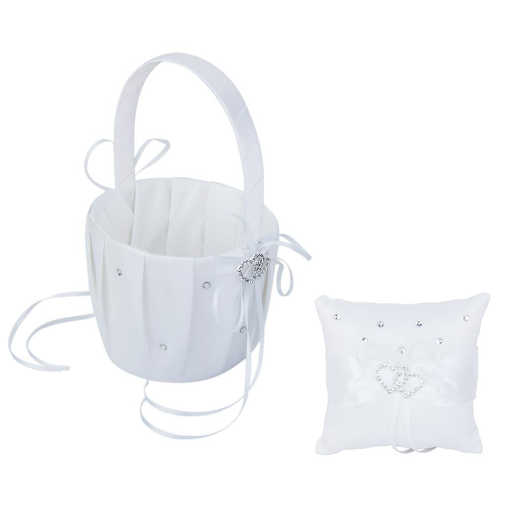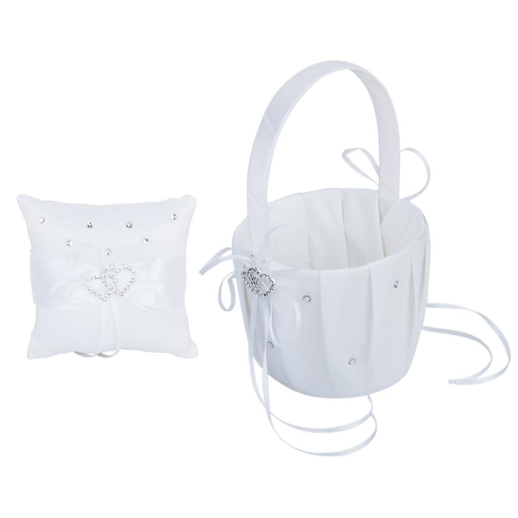 Maxbell Wedding Flower Girl Basket/Pocket Ring Pillow White Double Heart for Wedding