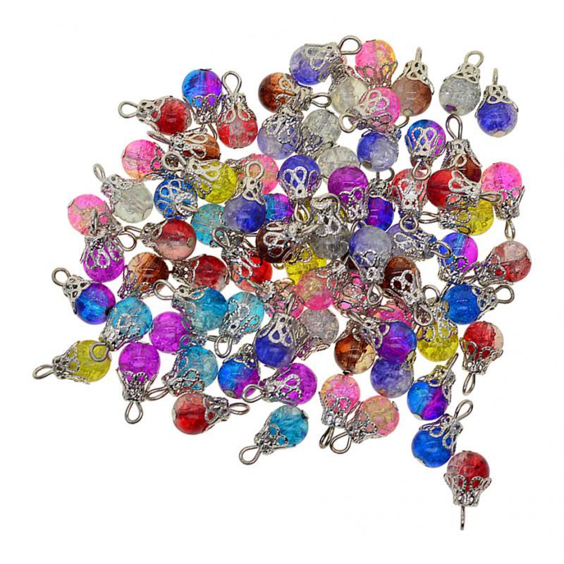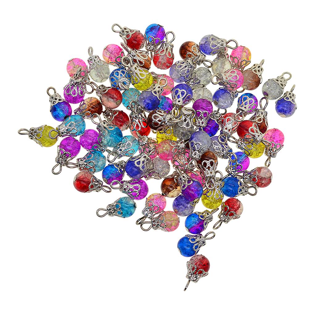 100 pieces multicolor round glass beads with daisy flower caps , handcrafted with flat head pin, making it a ready to use dangle charms