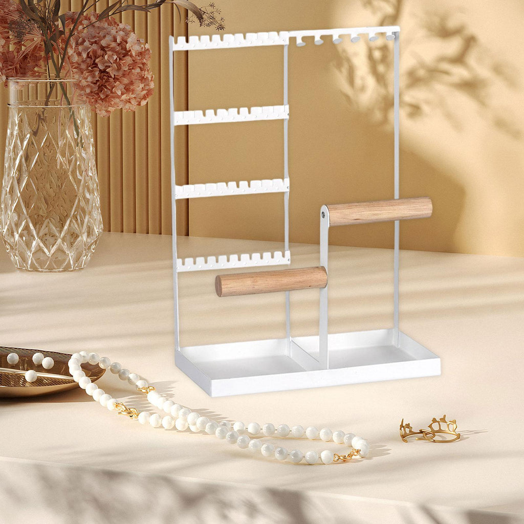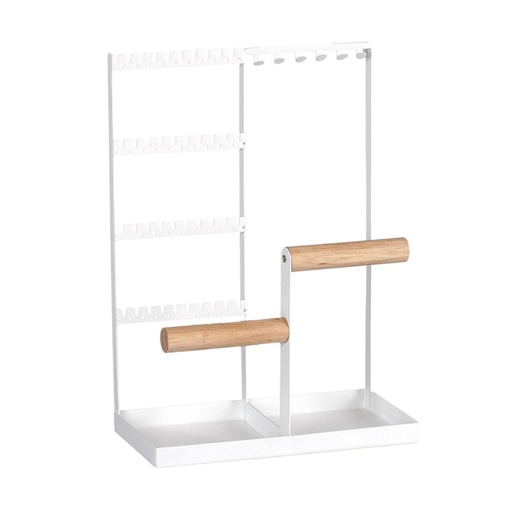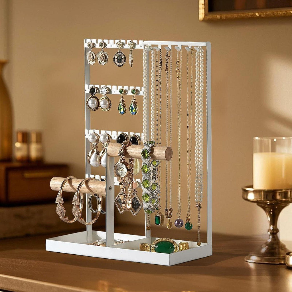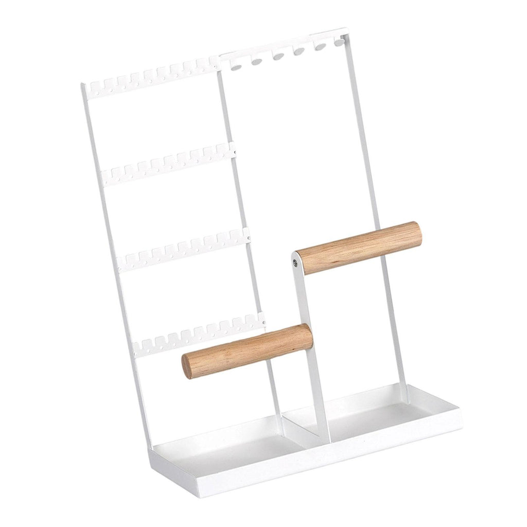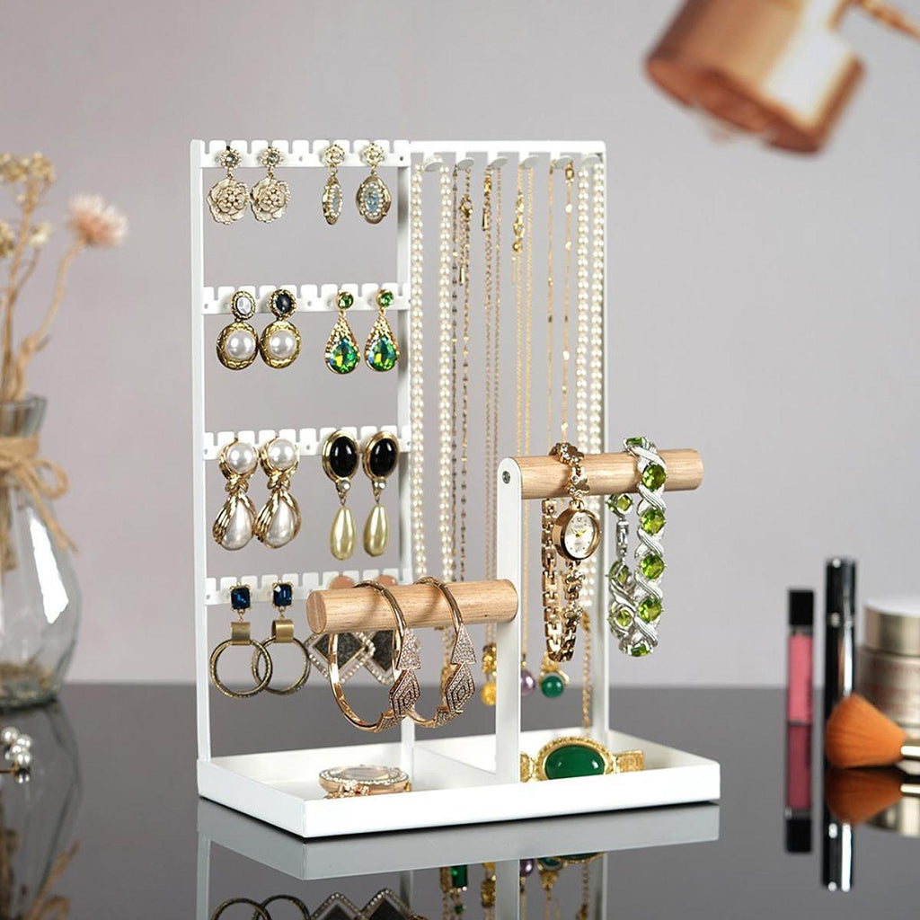 【Large Storage Space】: Jewelry Rack Organizer comes with 4 tiers of earring racks, unique necklace display racks and bracelet rack, rings tray, watch trays storage capacity is large enough to organize your necklaces, earrings, rings, bracelets, watches, hair clips and other small accessories