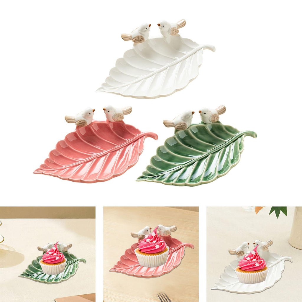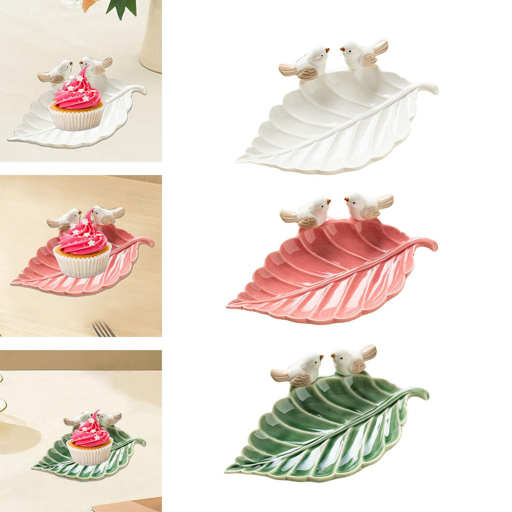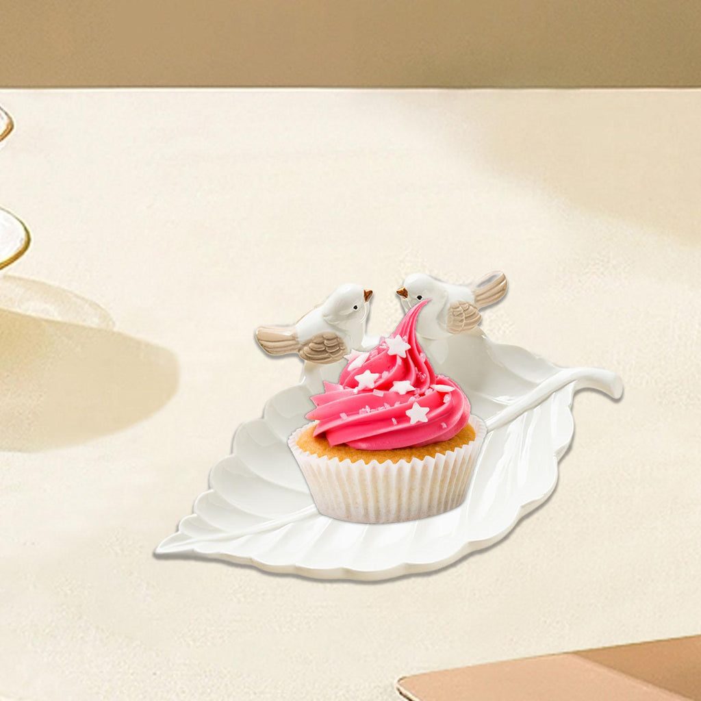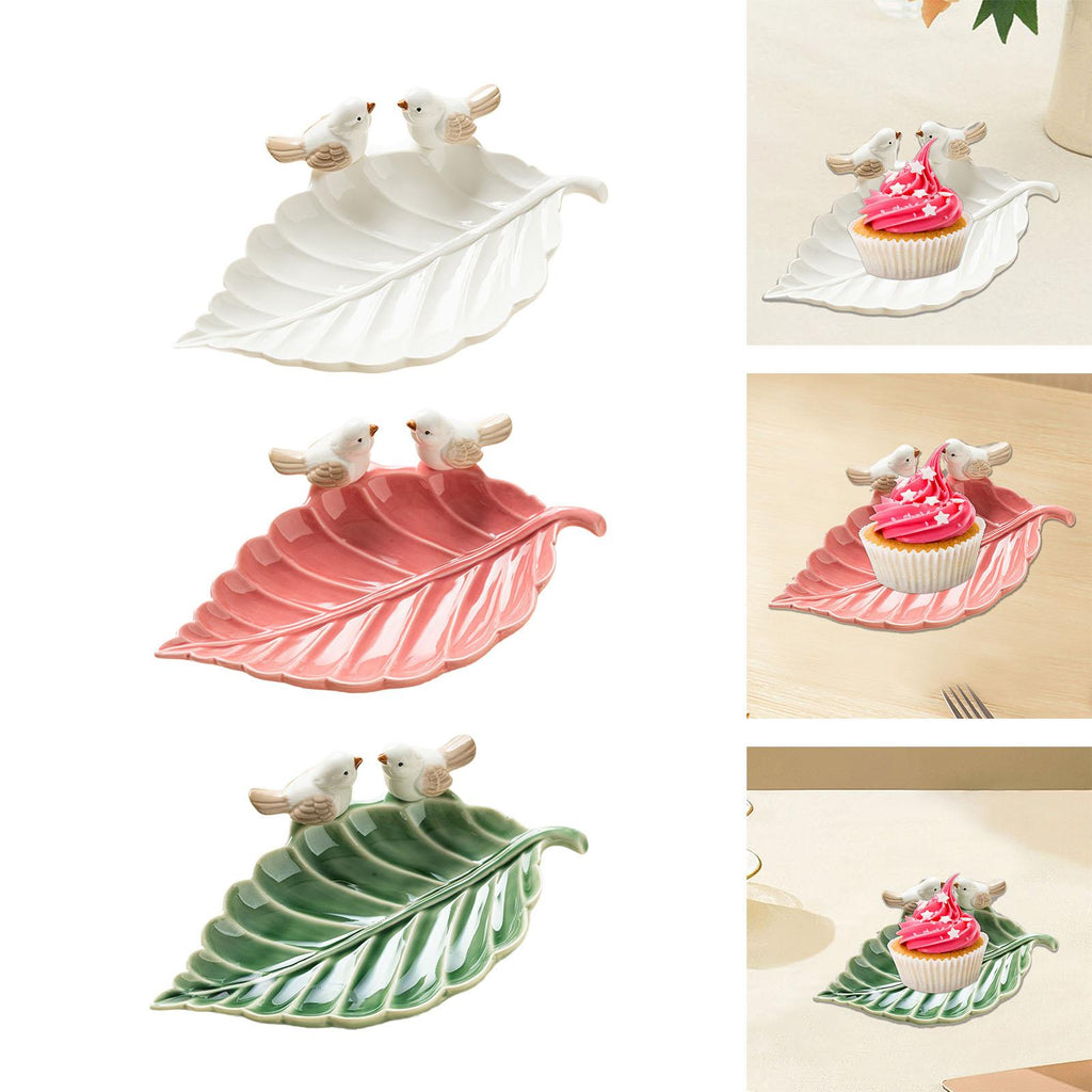 【Ceramic Material】Earrings Storage Plate Holder for Women is made of ceramic, fashionable leaf shape with two birds design, gloss glazed