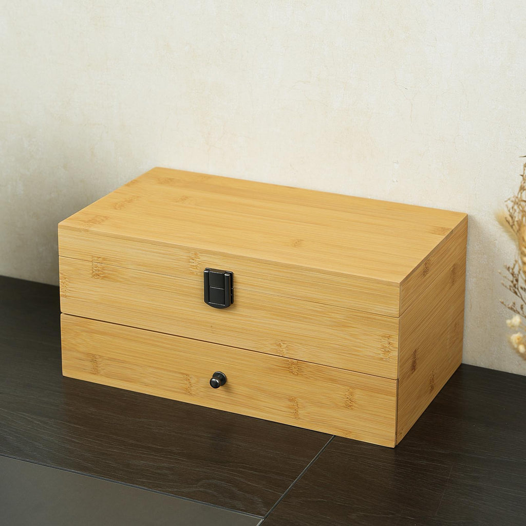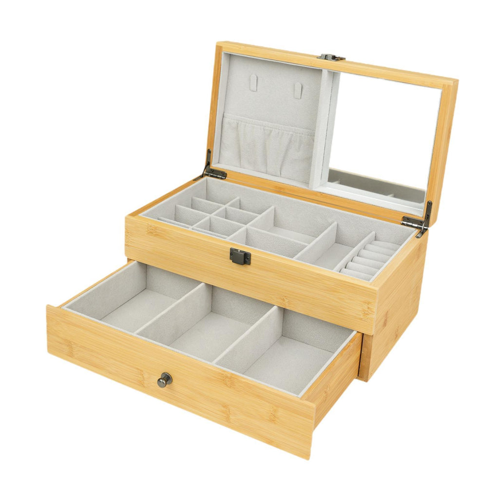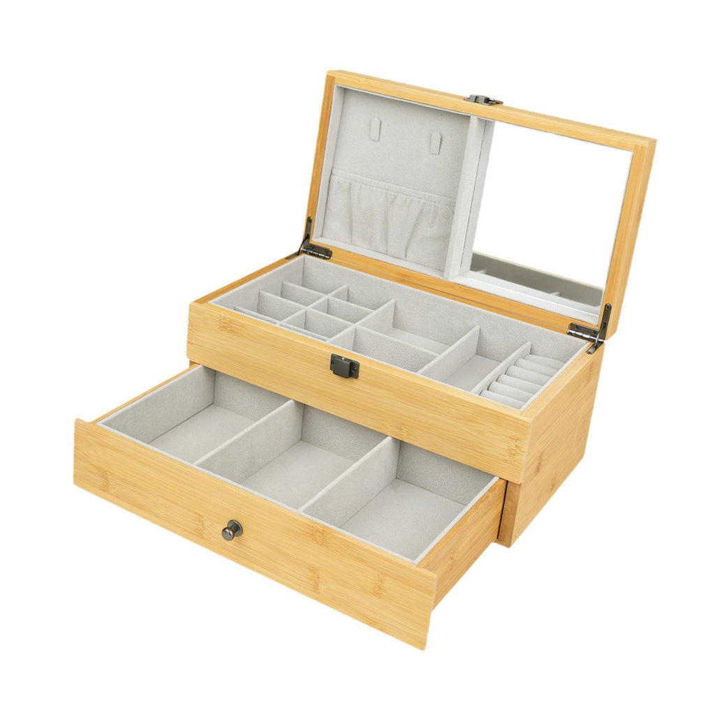 【Premium Material and Eco Friendly】: Crafted from bamboo board, hardware, and velvet material, this two layer jewelry box is both sturdy and environmentally friendly, providing a secure storage space for your precious accessories