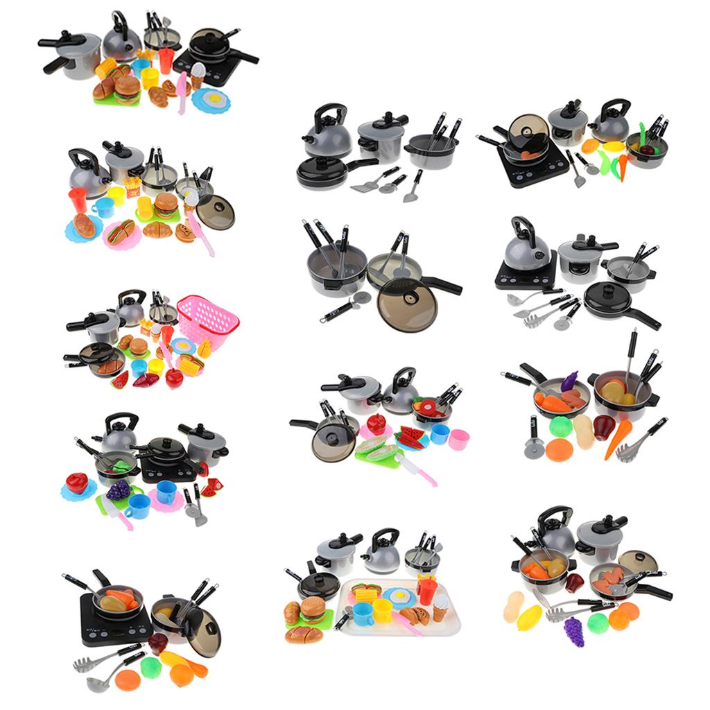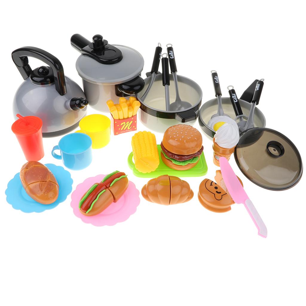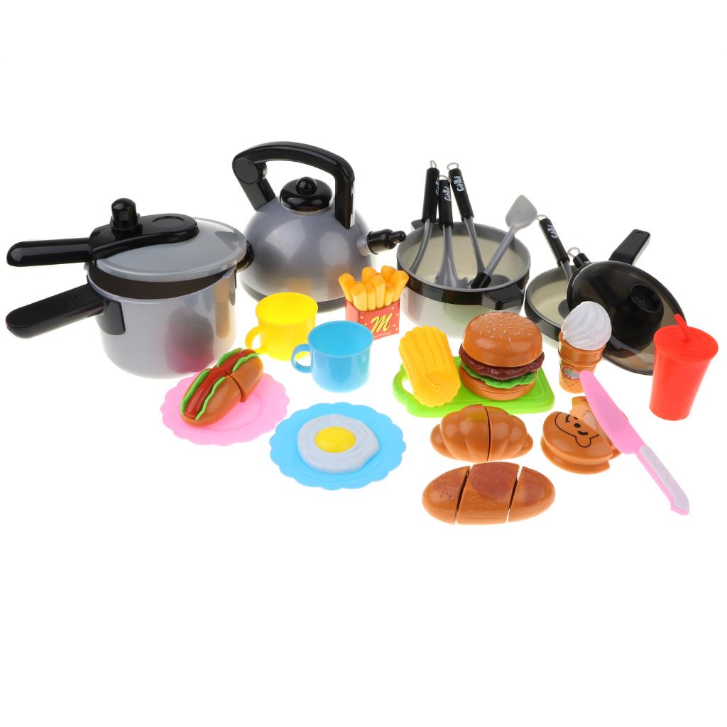 Includes 10pcs cooking tools: pans, spoon, spatula, cutter, kettle, and pressure cooker, and etc; 15pcs food cutting play set: fast food, corn, cup, hotdog, and etc