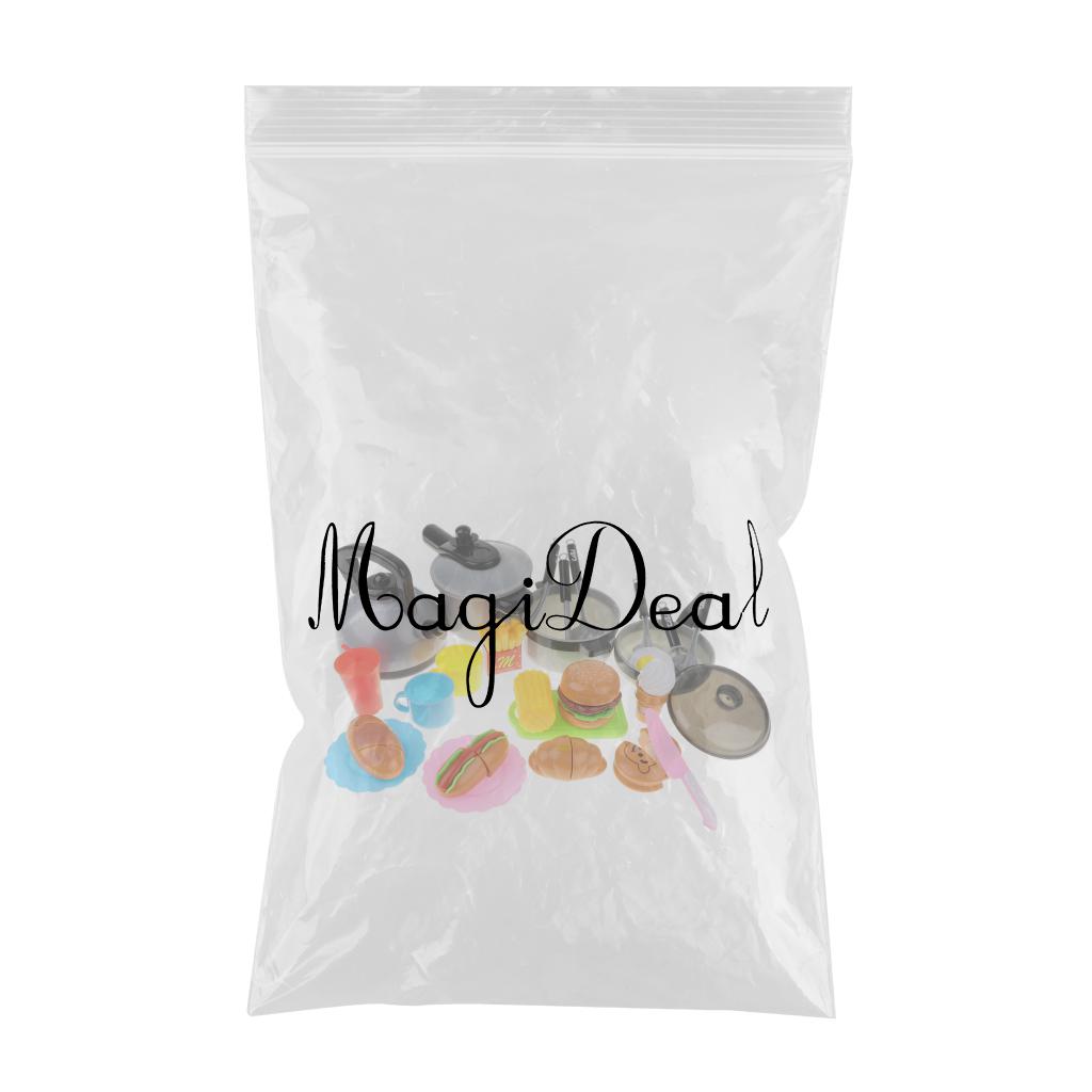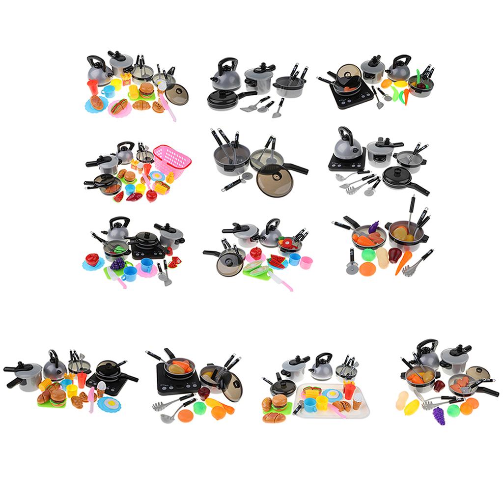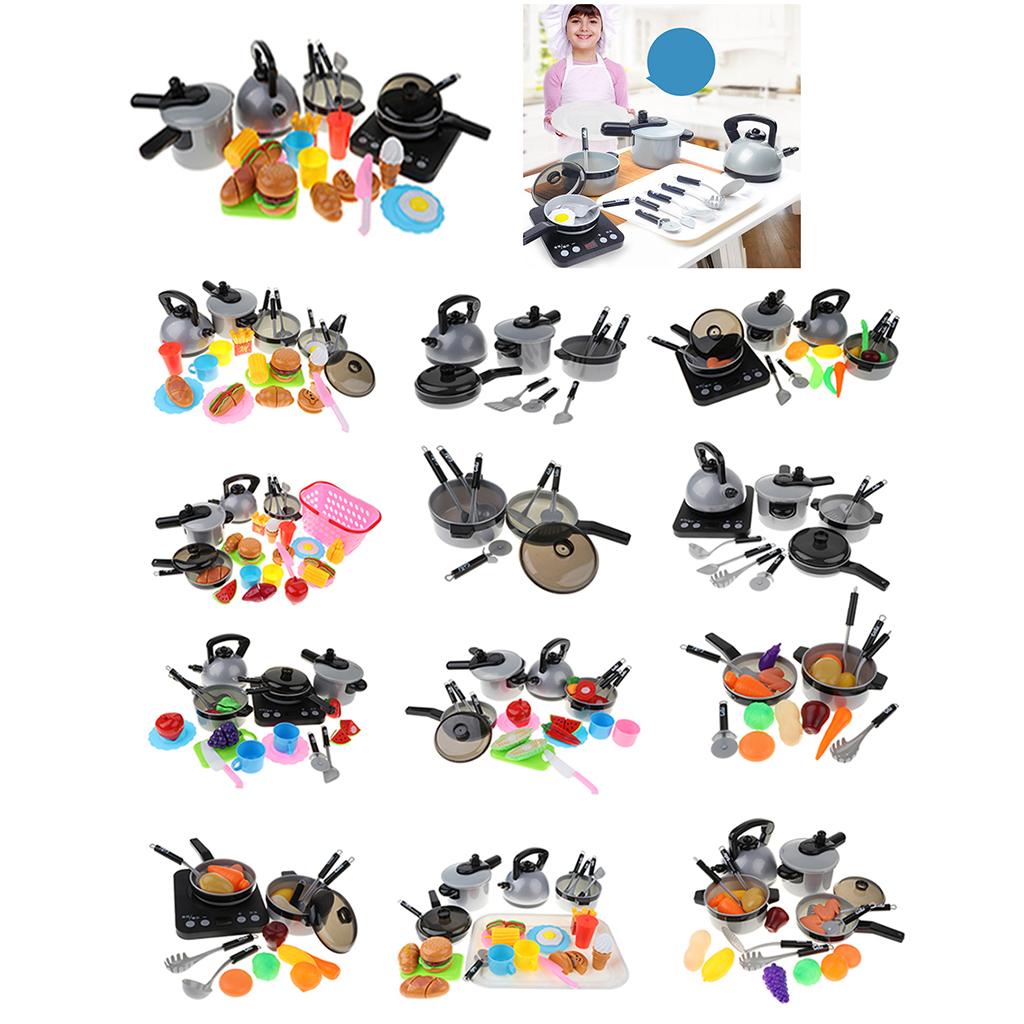 Includes 10pcs cooking tools: pans, spoon, spatula, cutter, kettle, and pressure cooker, and etc; 15pcs food cutting play set: fast food, corn, cup, hotdog, and etc