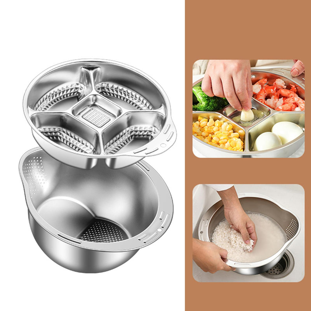 - 【Versatile 2 in 1 Design】: This practical stainless steel colander set combines Vegetable prep plate, and washing bowl in a space saving system for multiple kitchen tasks