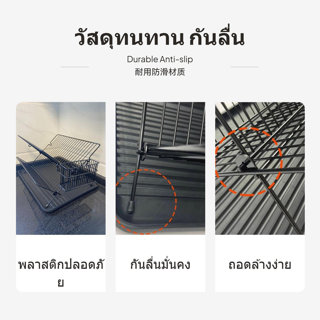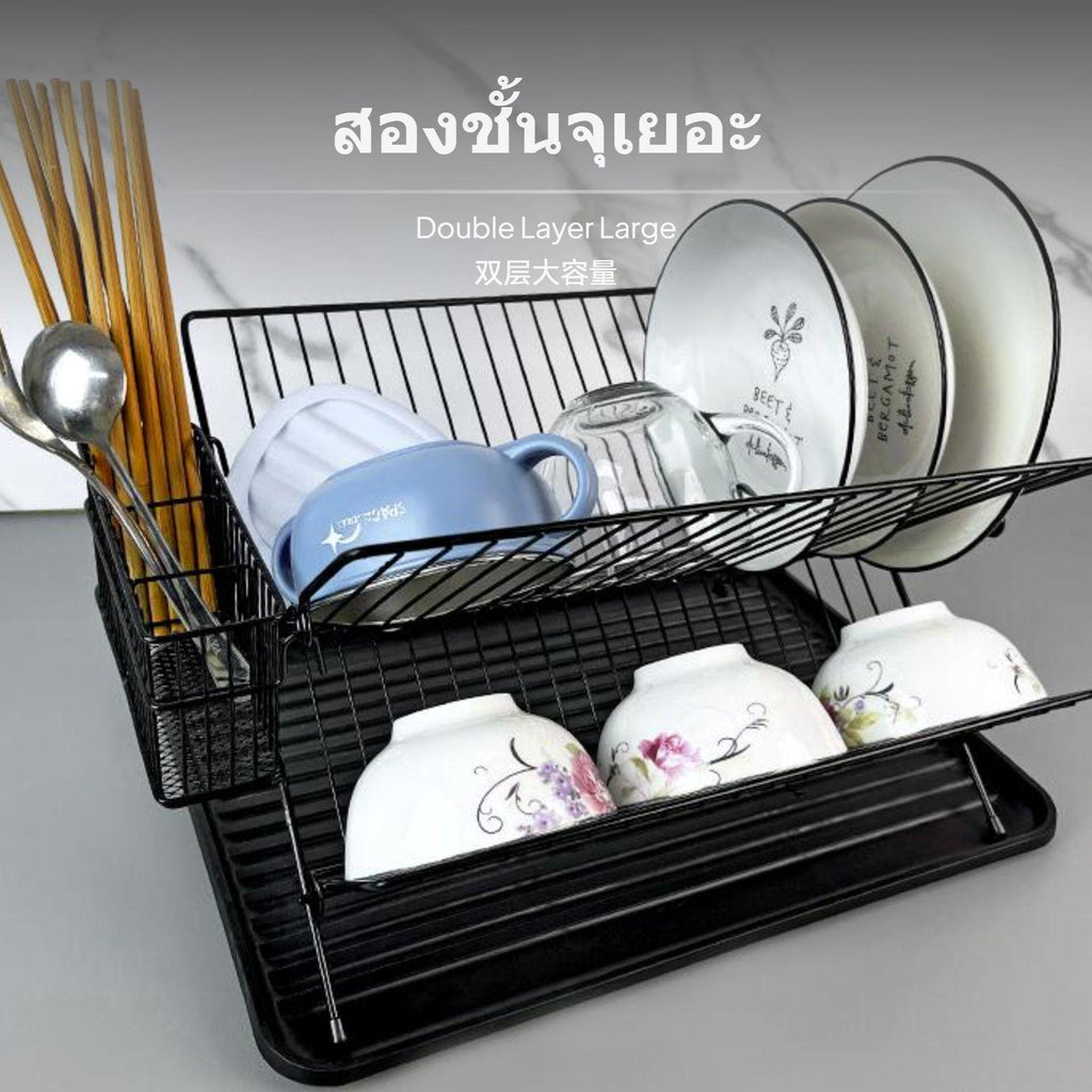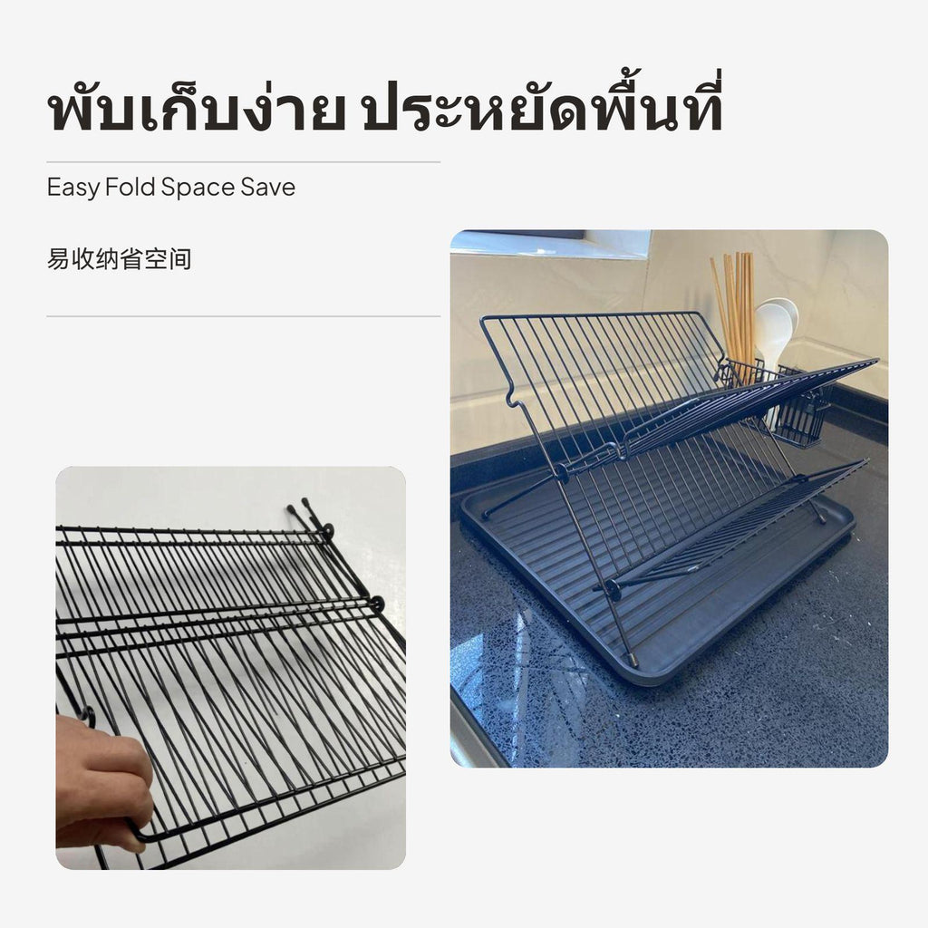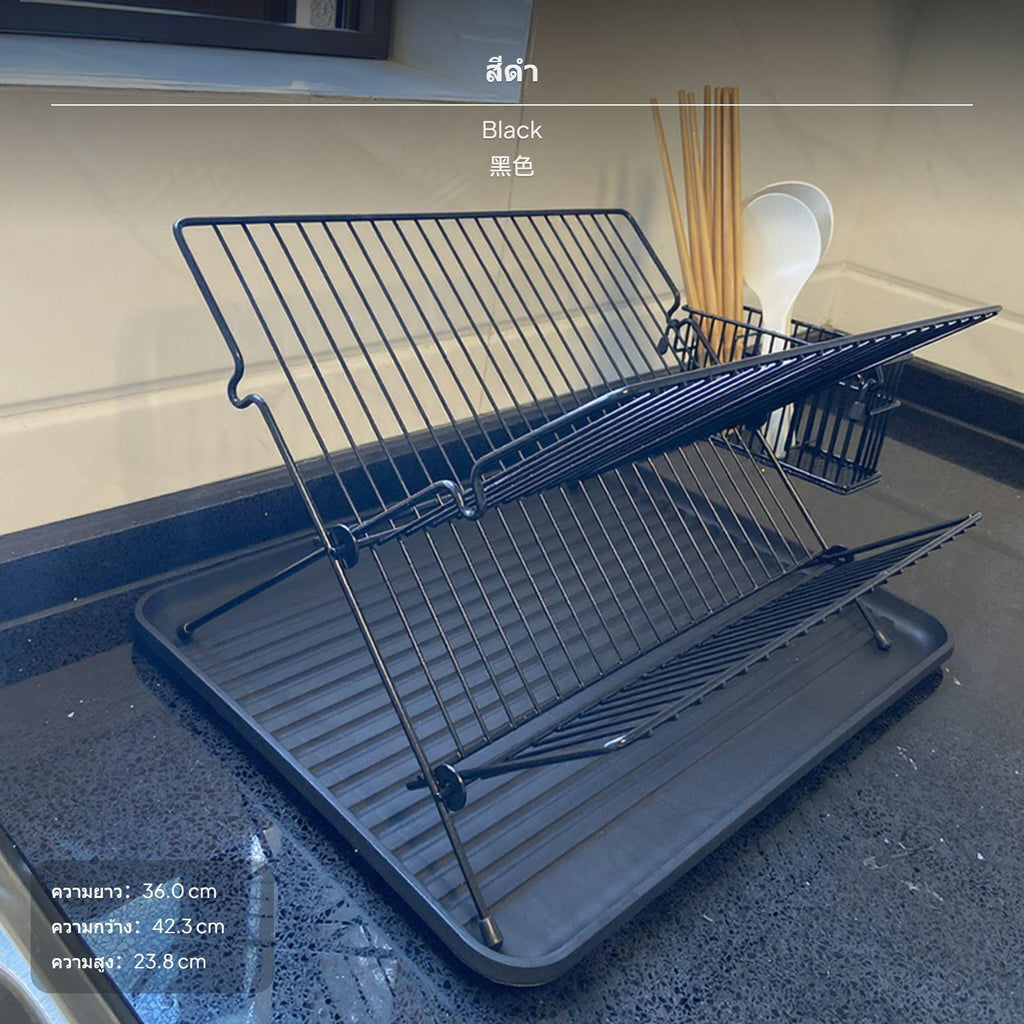 [Space-Saving Foldable Design] This foldable dish drying rack maximizes kitchen counter space with its innovative X-shaped framework, making it perfect for small-sized kitchens and easy storage when not in use.[Efficient two-level Storage] The twotier rack provides generous space for plates, bowls, cups, and utensils, helping keep your kitchen organized and your tableware easily accessible.[Rust-Resistant Metal Material] Crafted from high-quality metal, this dish rack features a sleek dark coating that resists oxidation and maintains its appearance over time.[Integrated Utensil Holder & Drip Tray] Comes with a convenient utensil holder and a drip tray to collect excess water, keeping your countertop tidy and dry for commonplace use.[No Installation Required] Designed for easy countertop placement, this dish rack is prepared to use straight from the packaging – perfect for modern kitchens seeking hassleeffortless organization.Specification: