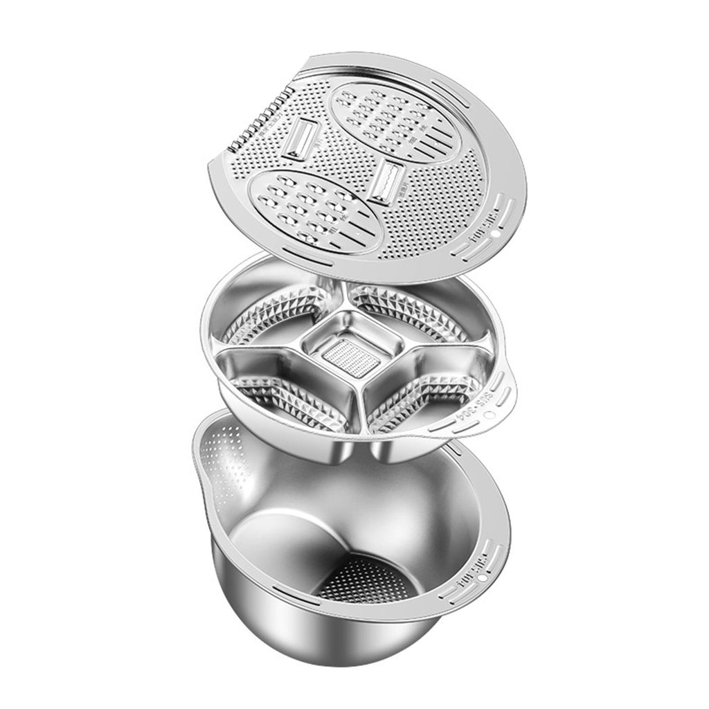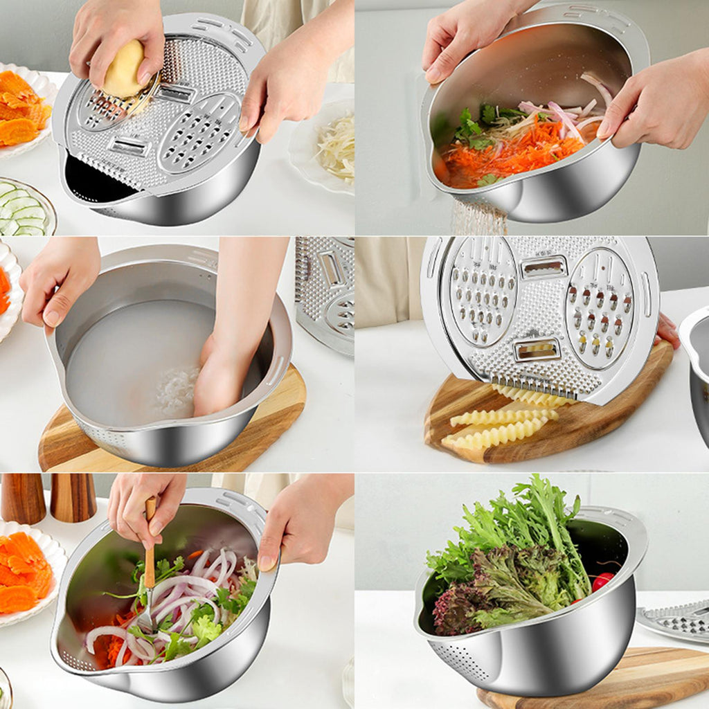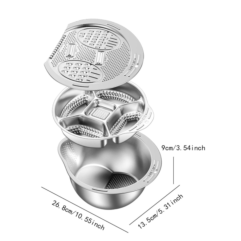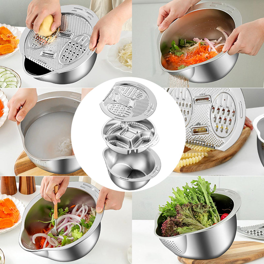 - 【Versatile 3 in 1 Design】: This practical stainless steel colander set combines a grater lid, Vegetable prep plate, and washing bowl in a space saving system for multiple kitchen tasks
