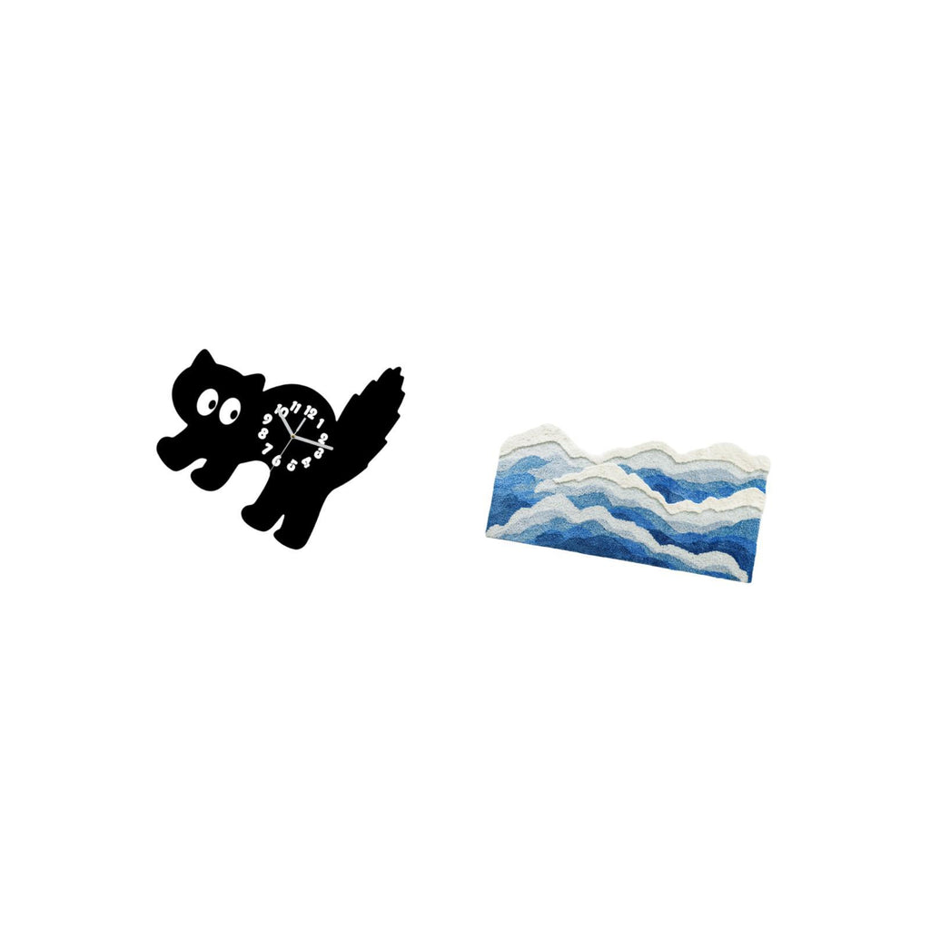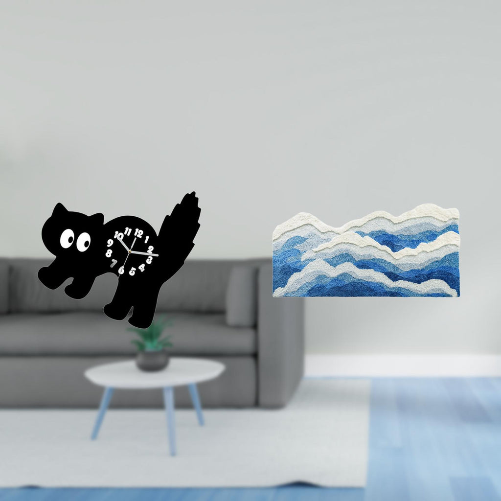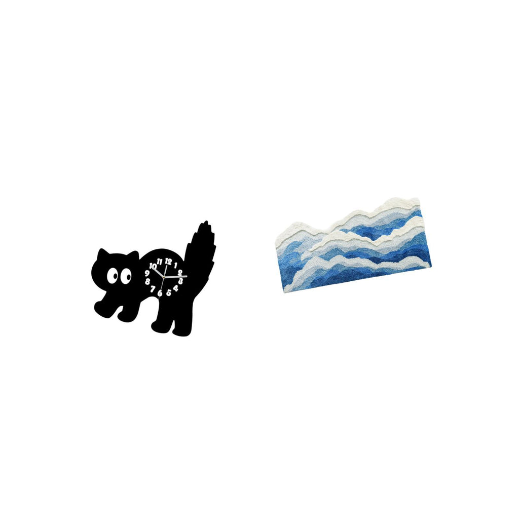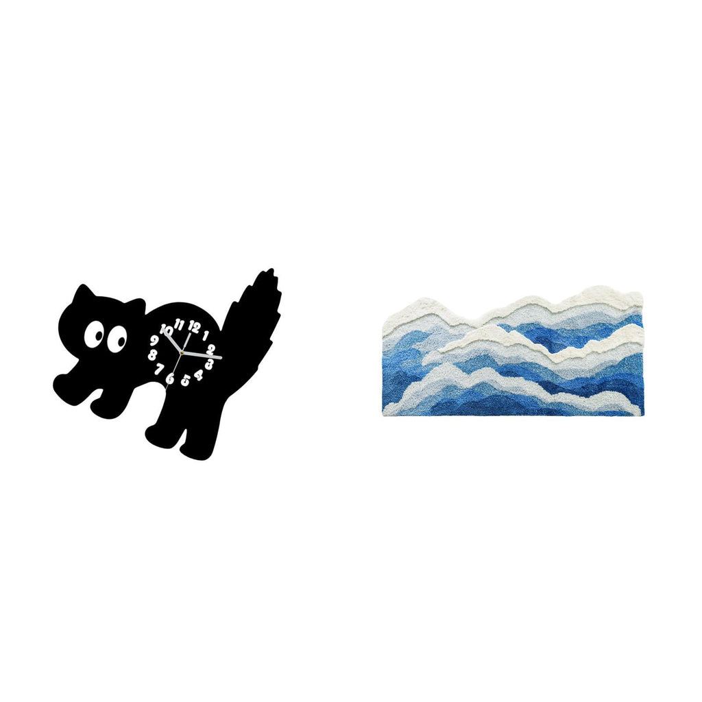 - 【Silent Operations】 The clock operates silently and is suitable for a good 2. 【Material】 The clock is made from acrylic material and the rug is made of flocking material 3. 【Versatile Use】 The clock and rug are suitable for bedrooms kitchens living rooms and more 4. 【Design】 The clock is a cute cartoon cat and the rug features ocean waves and a 3D design 5. 【Gifts】 The clock is an gift for family and friends who love cats