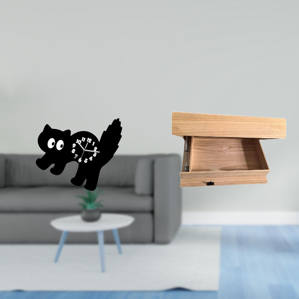 - 【Silent】 This cartoon cat clock operates without ticking sound and is suitable for 2. 【Material】 Made from acrylic and wood this wall clock and shelf are sturdy and wear resistant 3. 【Versatile】 Suitable for living room bedroom dining room study room office school kitchen and home decor 4. 【Size】 The clock and shelf have compact dimensions and are for small space 5. 【Gift】 This clock and shelf make an gift for family and friends who love cats