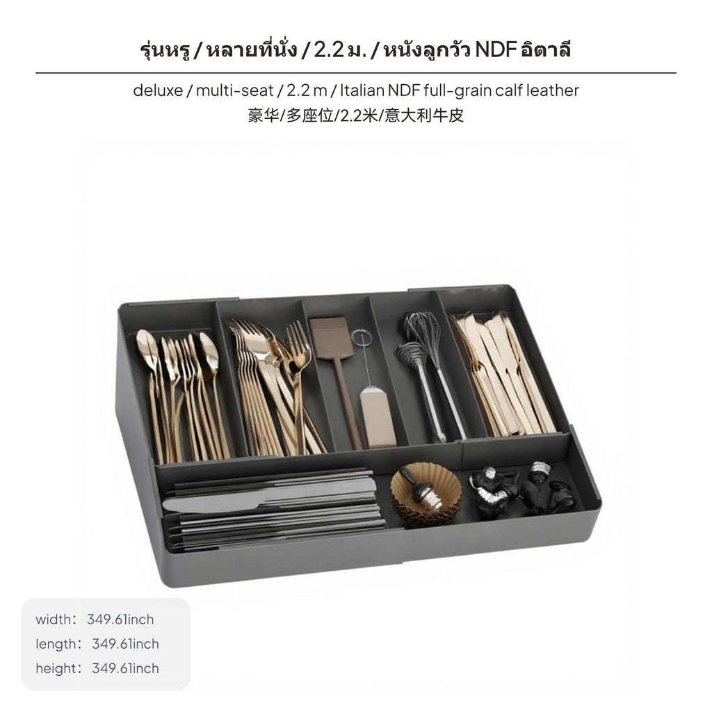 [adaptable Drawer Organizer] This adjustable drawer organizer with 7 compartments and 2 removable dividers offers optimal storage for kitchen utensils, cosmetics, and small office supplies.[Customizable & Expandable] Features a four-direction expandable design, allowing horizontal and upright adjustment from 27cm to 51cm to fit various drawer sizes for personalized organization.[Modern Minimalist Design] The sleek black color and simple Japanese-inspired design make this box easily integrate into kitchen, bedroom, or workspace environments, elevating the interior aesthetic.[Sturdy framework with Easy Cleaning] Made from premium PET material with reinforced groove system, ensures stable partitioning and tidiness; detachable parts make cleaning simple.[Multi-Scenario Storage Solution] Whether used for tableware, stationery, or cosmetics, every item has a dedicated space, eliminating clutter and simplifying everyday routines.Specification: