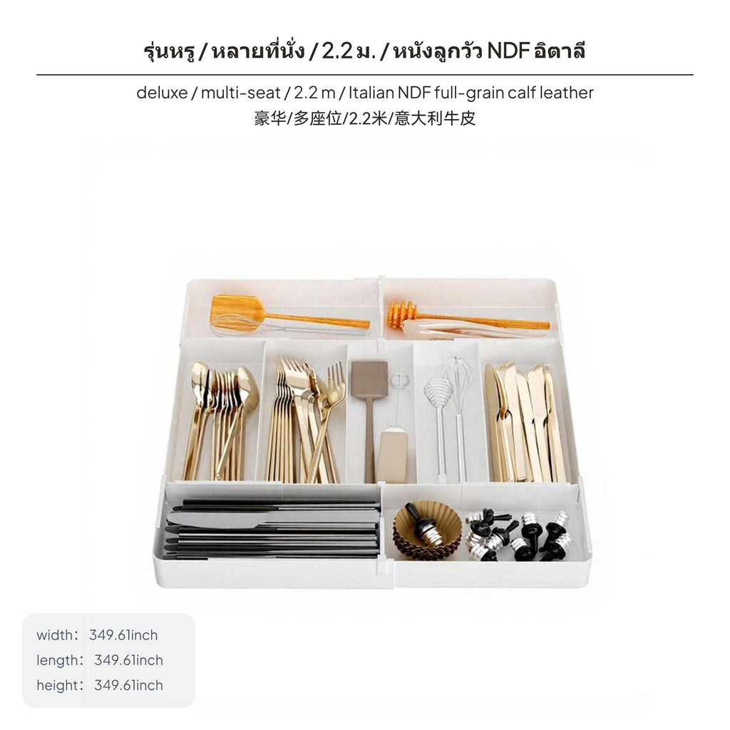 [adaptable Drawer Organizer] This adjustable drawer organizer with 7 compartments and 2 removable dividers offers optimal storage for kitchen utensils, cosmetics, and small office supplies.[Customizable & Expandable] Features a four-direction expandable design, allowing horizontal and upright adjustment from 27cm to 51cm to fit various drawer sizes for personalized organization.[Modern Minimalist Design] The sleek black color and simple Japanese-inspired design make this box easily integrate into kitchen, bedroom, or workspace environments, elevating the interior aesthetic.[Sturdy framework with Easy Cleaning] Made from premium PET material with reinforced groove system, ensures stable partitioning and tidiness; detachable parts make cleaning simple.[Multi-Scenario Storage Solution] Whether used for tableware, stationery, or cosmetics, every item has a dedicated space, eliminating clutter and simplifying everyday routines.Specification: