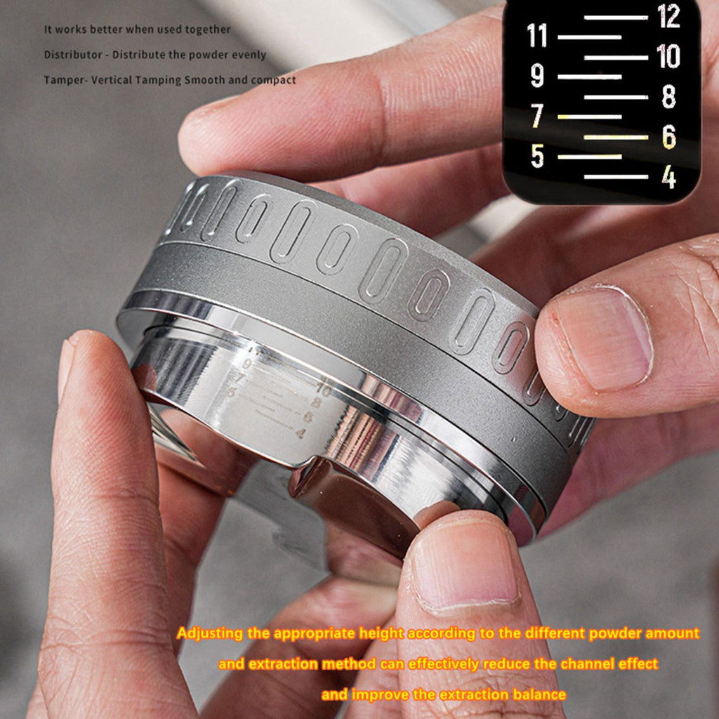 【Adjustable】: The adjustable scale feature allows you to customize the height according to different powder amounts and extraction methods, effectively reducing channeling effect and enhancing extraction balance, designed for precision and efficiency in coffee brewing.