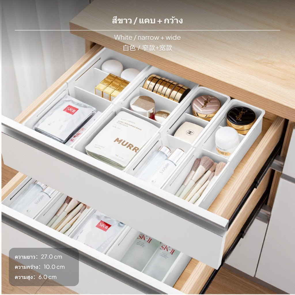 [Efficient Expandable Organizer] This drawer organizer box features expandable length from 27cm to 38.5cm, flexible divider panels, and a rectangular design, enabling precise storage for makeup, stationery, and assorted items.[Customizable Layout Solution] The removable and adjustable divider system allows you to easily organize and separate various objects, realizing personalized storage for every drawer scenario such as vanity, study, desk, or kitchen.[Premium PP Material] Made from high-quality single-piece molded PP material, the organizer has a polished-surface that is easy to wipe clean, combining visual appeal with practical function and enduring value.[adaptable for Multiple Scenes] Whether for cosmetics, cables, office supplies, or utensils, this Japanesedesign timeless box adapts smoothly to changing needs, ensuring optimized drawer organization at home or in the office.[Choice of hues Sizes] Available in timeless ivory or transparent to match various interiors; choose between slim or wide choices, both with extendable fit and functional partitioning for enhanced convenience.Specification: