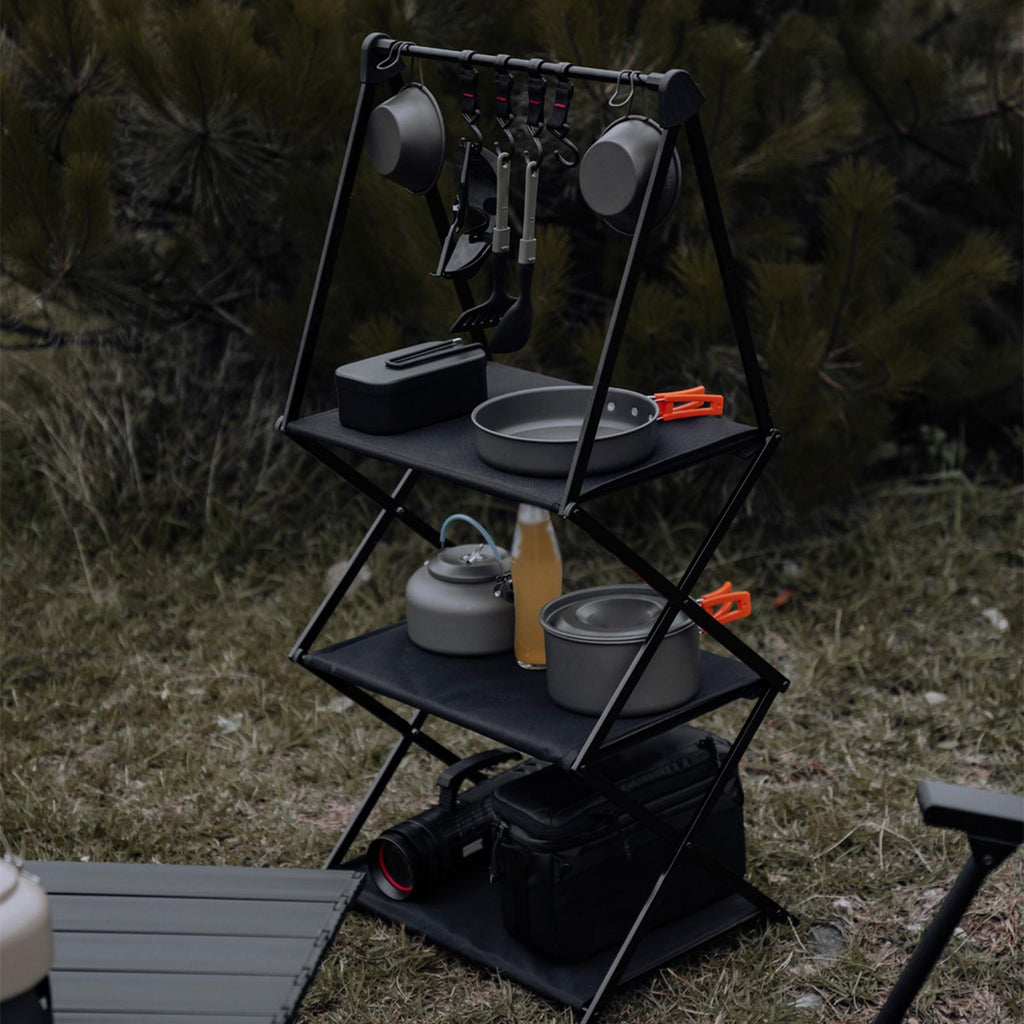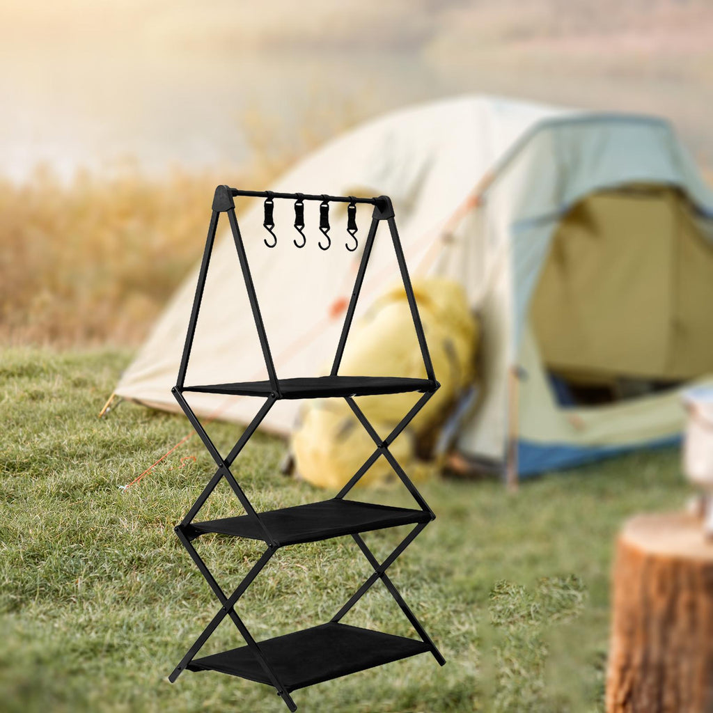 Camping Storage Shelf: Multifunctional folding storage shelf, Outdoor camping rack portable folding aluminum alloy hook storage table, easy to store.