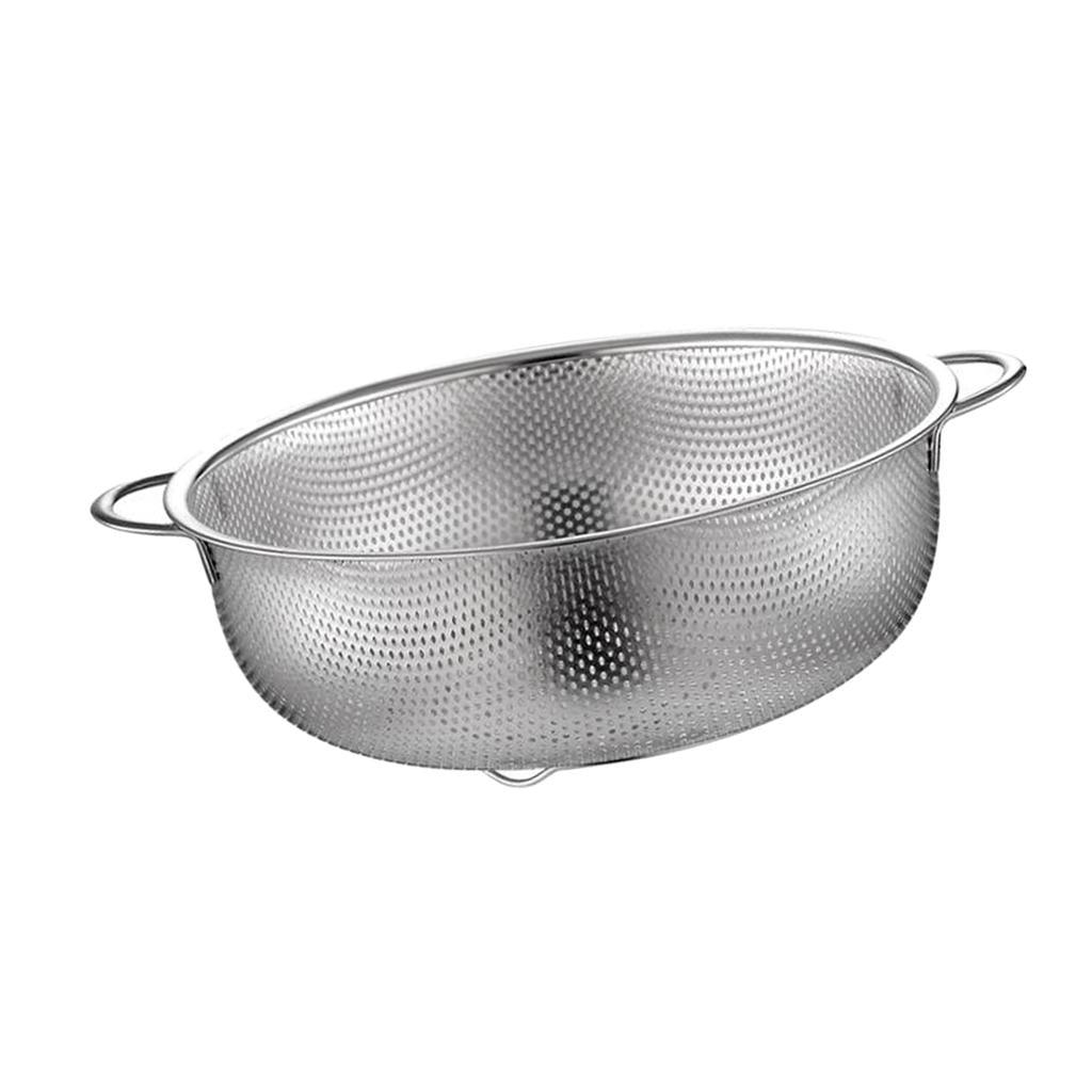 MICRO-PERFORATED: Tiny holes of the colander prevent Fall-Through, While Still Providing Quick Drainage. They allow water to pass easily but at the same time keeping all food in the colander. It goes with 3 legs on the bottom, which prevents the colander from tipping over. And it is wide enough to let water drain quicker and spend less time on cooking.