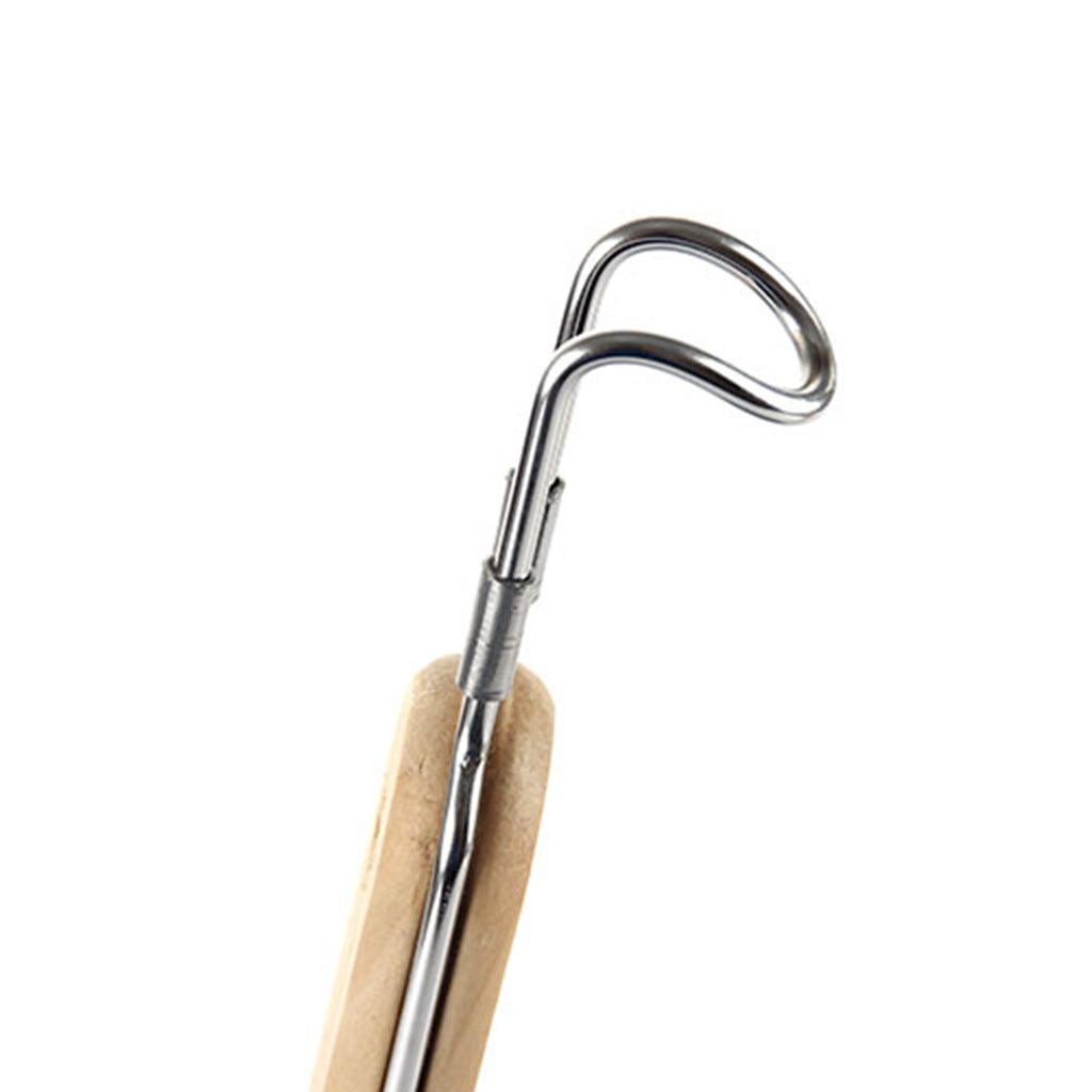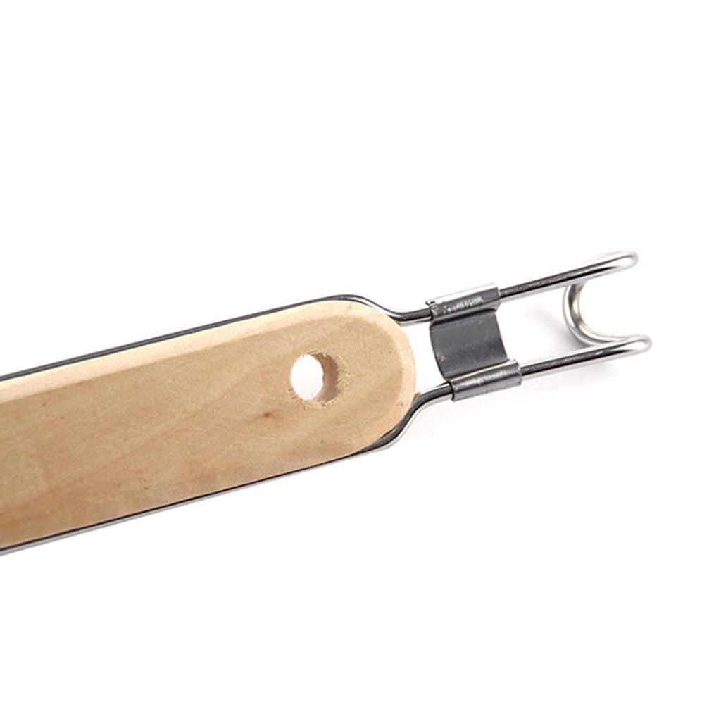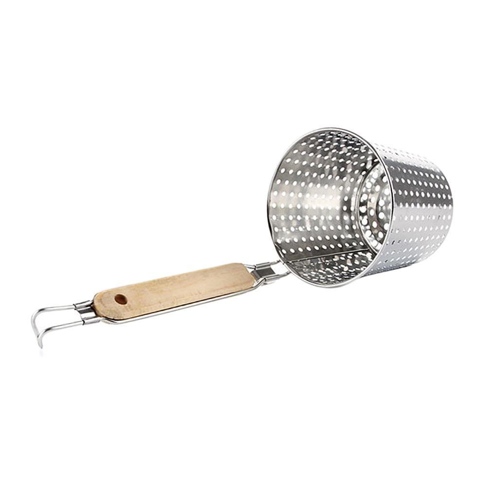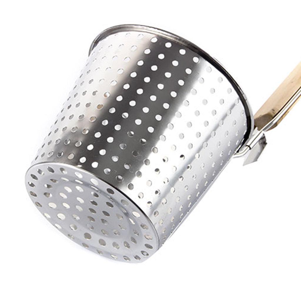 Made from stainless steel mesh with sturdy wire frame; wooden handle with hook conveniently hangs on the pot while in use and stores away easily