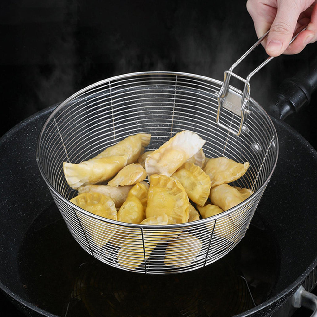 【Multi Use】: Stainless steel food colander great for filtering oil or water while you fry your favorite dishes, noodles, vegetables, meats, and more, which help you pick up the ingredients accurately.