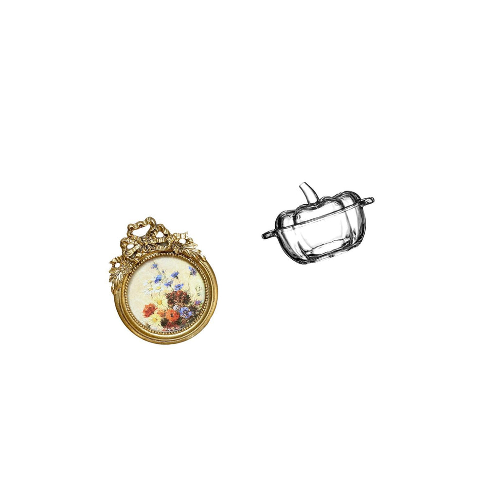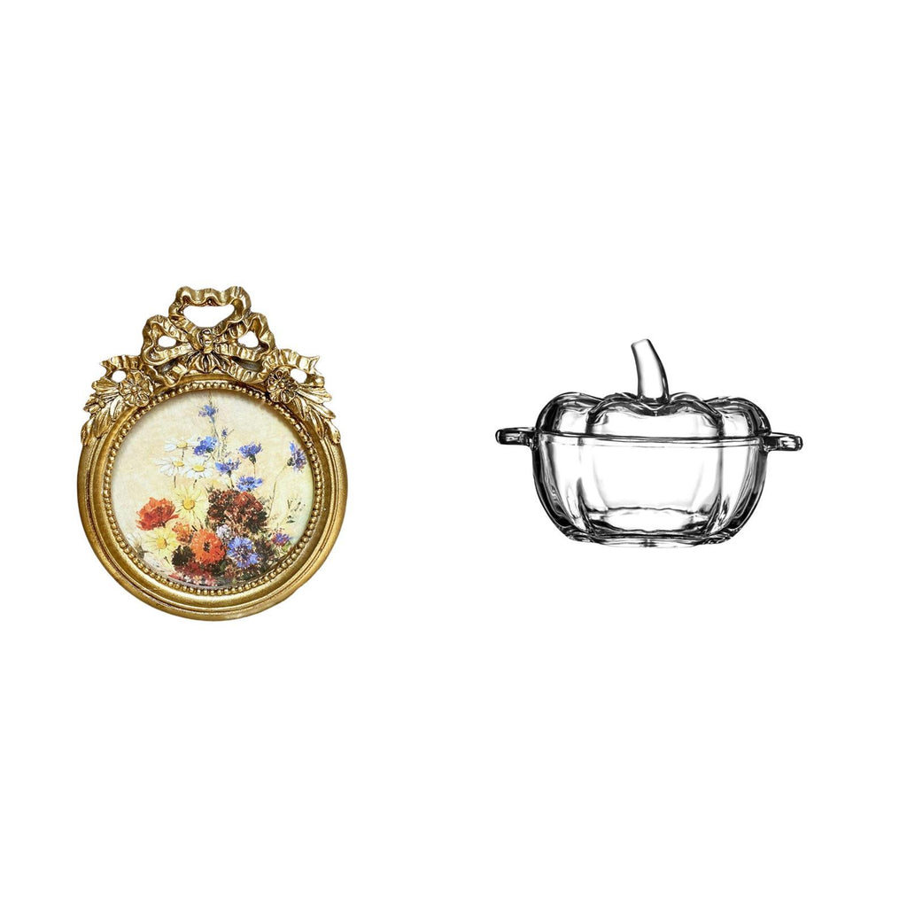 Ornate European Round Photo Frame and Pumpkin Shaped Glass Candy Dish with Lid for Wedding Gift Ideas and Cookie Jar Display