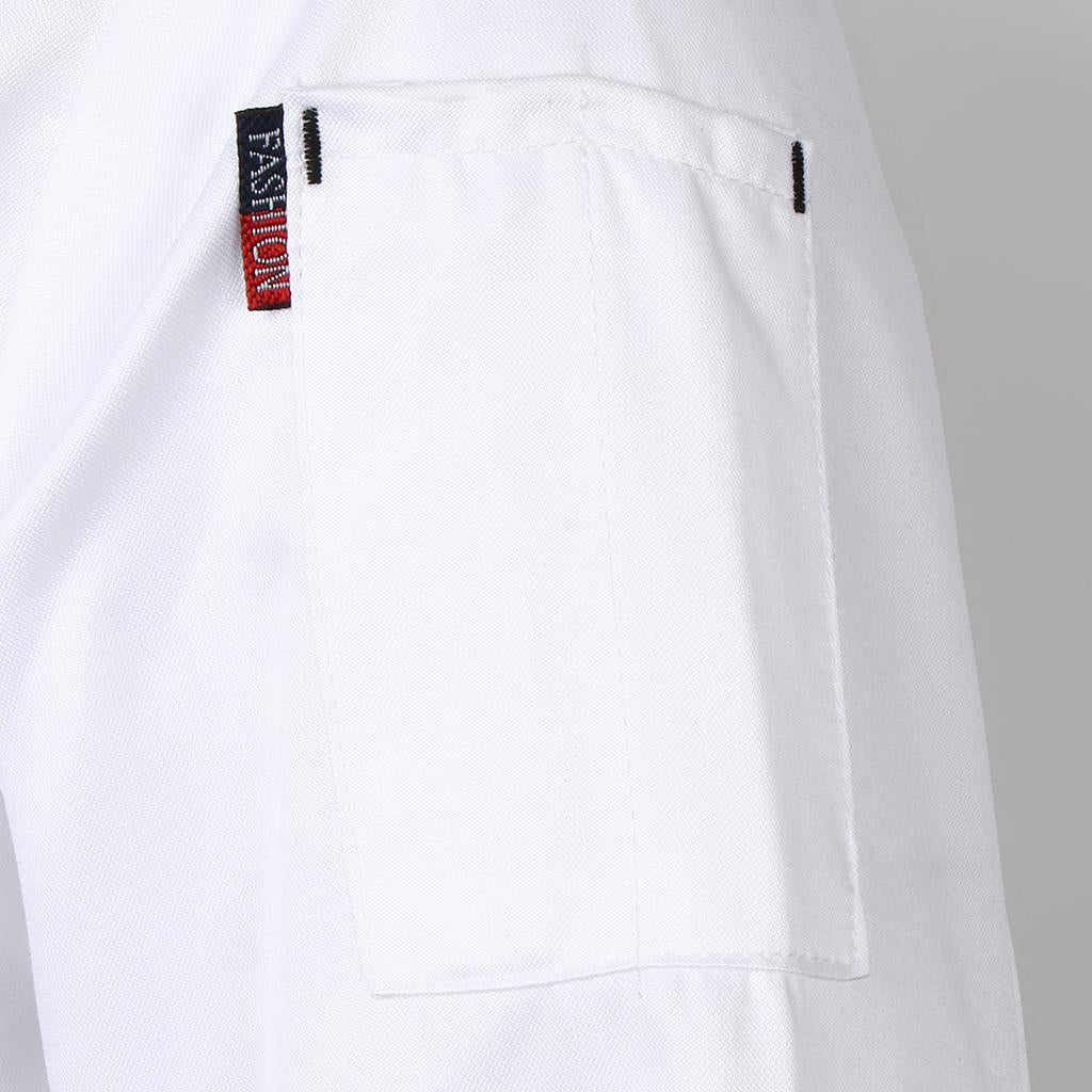 Left arm thermometer pocket, pen pocket and double-breasted design, durable polyester and spandex material