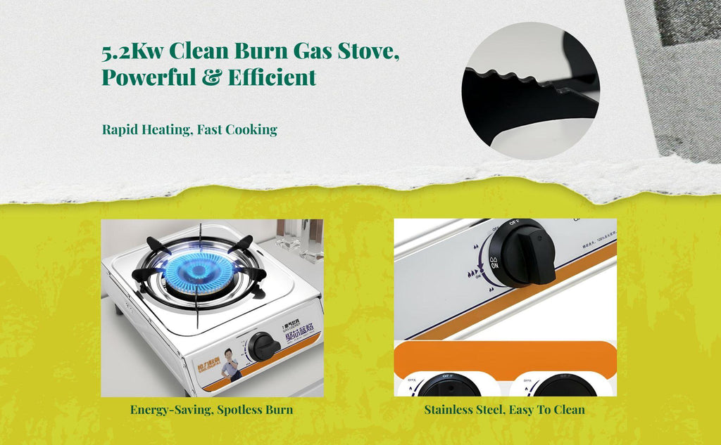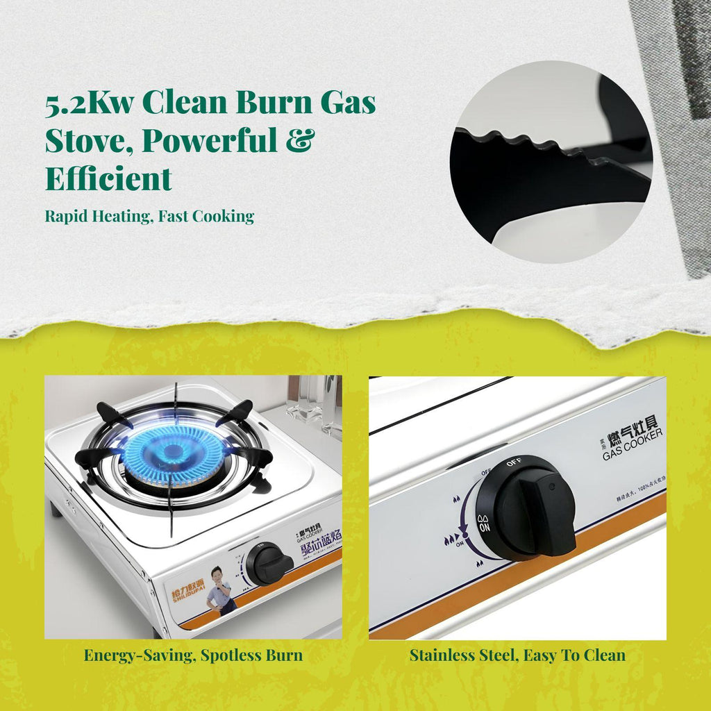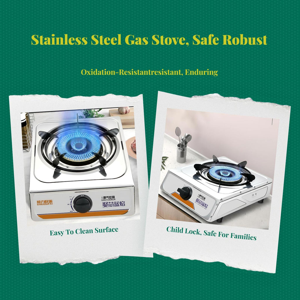 【Efficient Single Burner Gas Stove for Home】This high-performance single burner gas stove is constructed with stainless steel, making it suitable for home kitchens, apartments, and restaurants. It supports both LPG and methane gas for flexible use.【Sturdy Stainless Steel & Easy to Clean】Crafted from robust stainless steel, this gas stove resists rust and is easy to maintain, ensuring enduring reliability and a clean cooking space.【Adjustable Heat Control & Energy Saving】The adjustable heat control enables precise temperature management, while its energy-saving design helps reduce gas consumption and cooking time.【Safety Features for Peace of Mind】Equipped with automatic shut-deactivate protection and a thermocouple safety device, this stove ensures dependable safety during use.【Wide Application & Practical Design】perfect for homes, apartments, canteens, and restaurants, this single burner gas stove deactivateers practical performance and outstanding value.Specification: