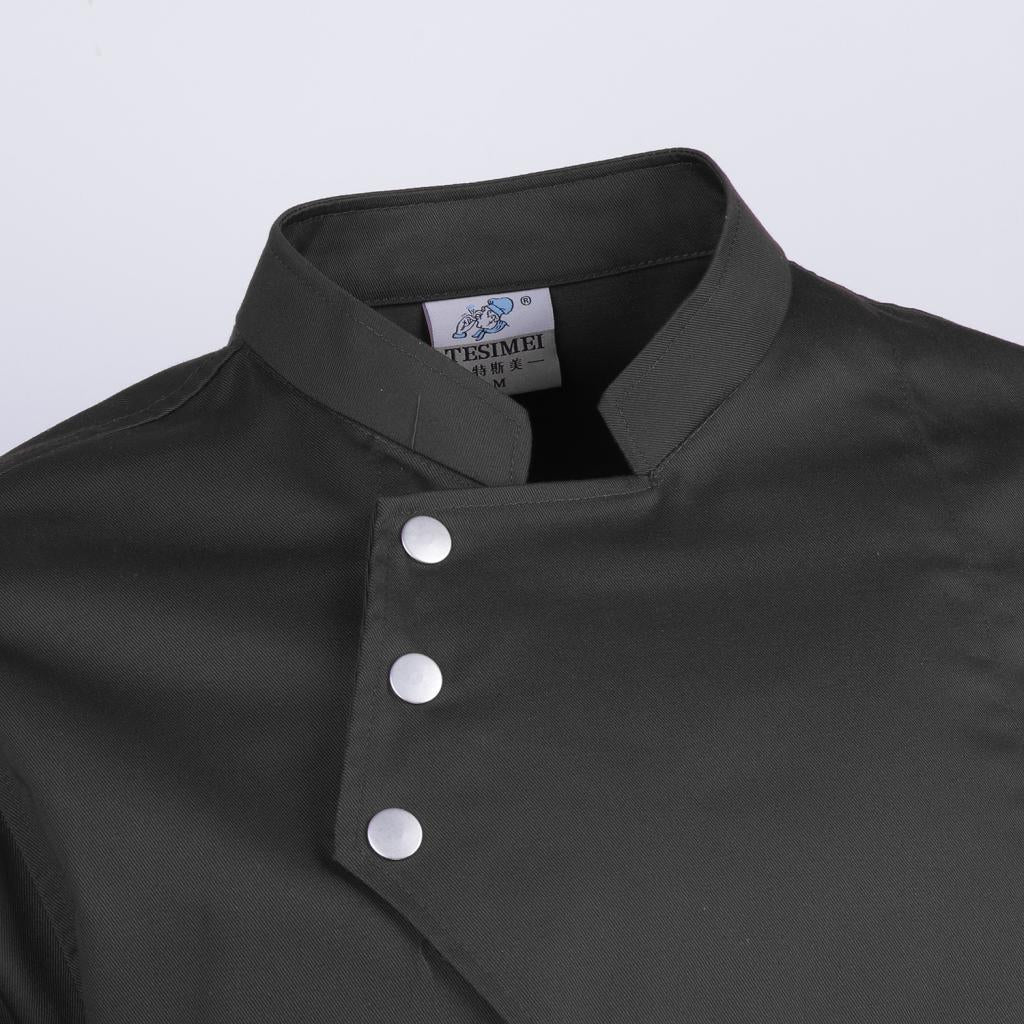 Solid color, single-breasted and long sleeves chef shirt, having left shoulder pockets and right breast pockets, mandarin collar.