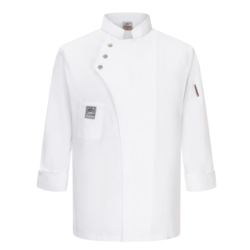 Solid color, single-breasted and long sleeves chef shirt, having left shoulder pockets and right breast pockets, mandarin collar.