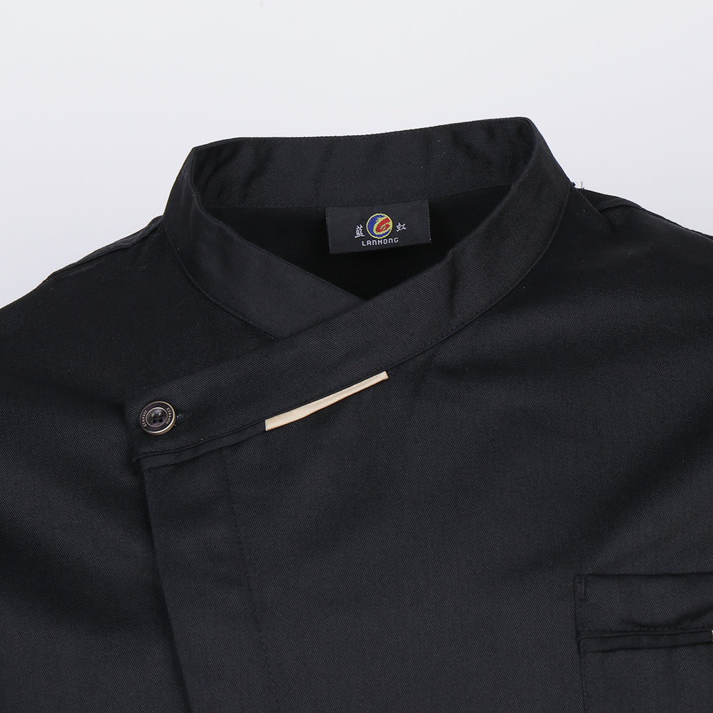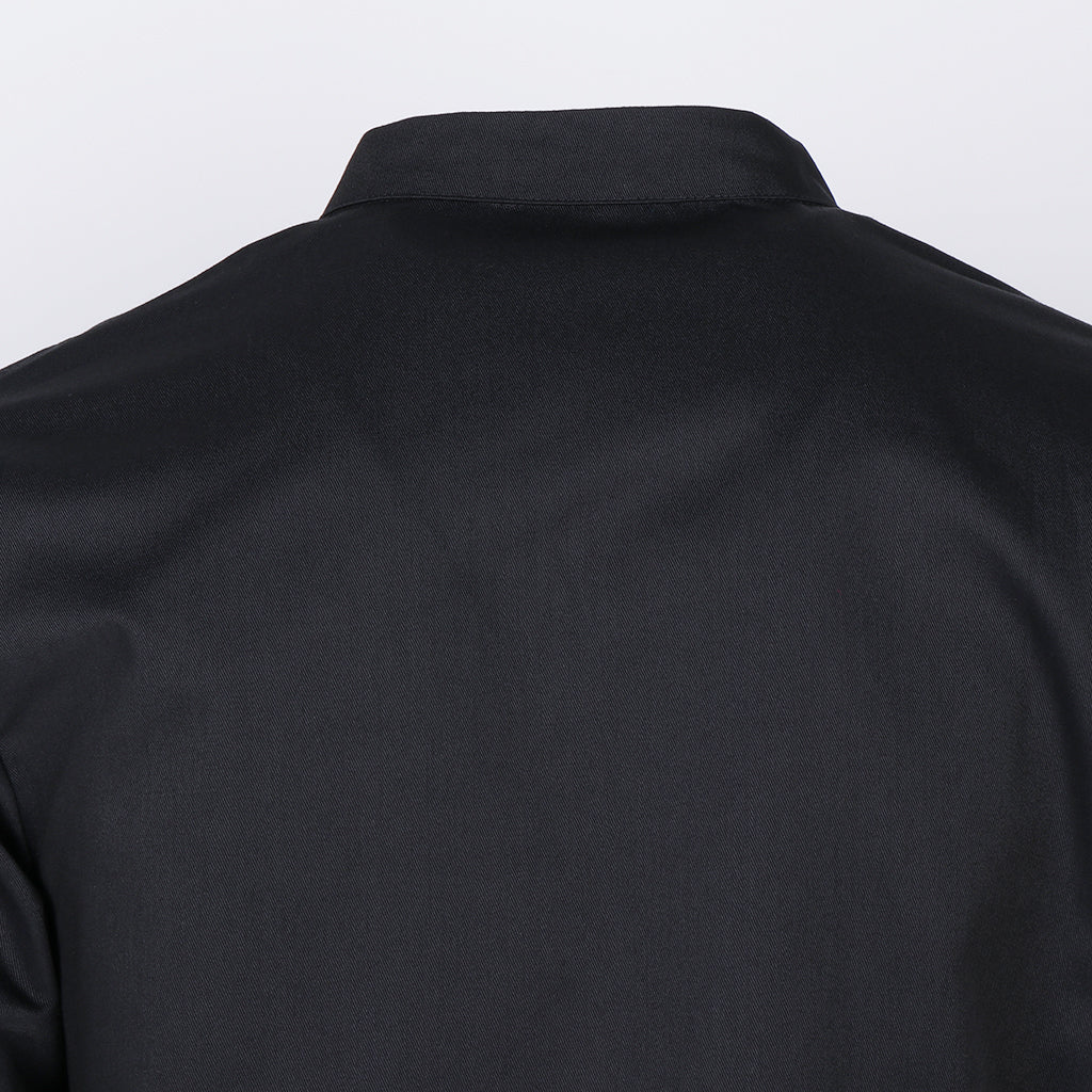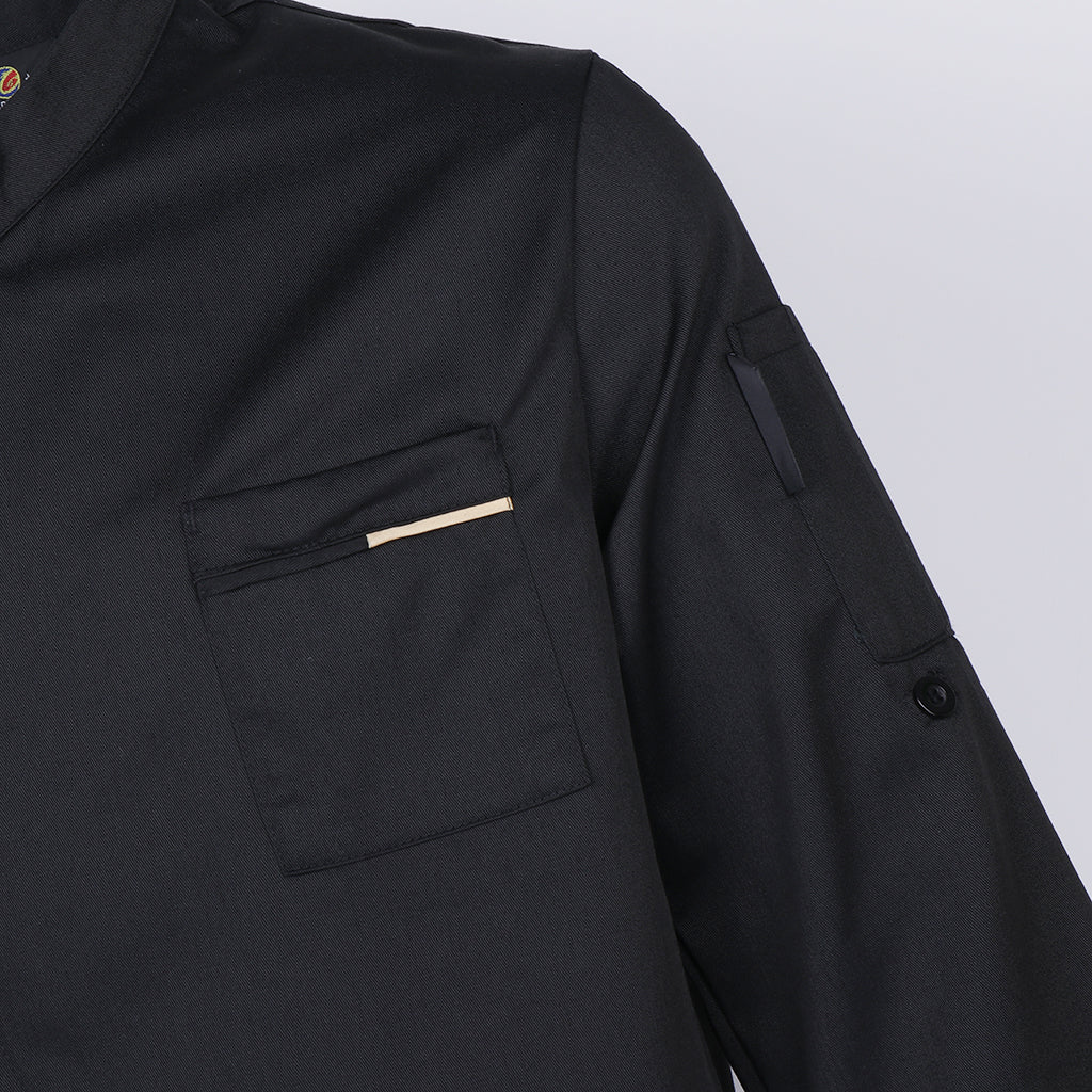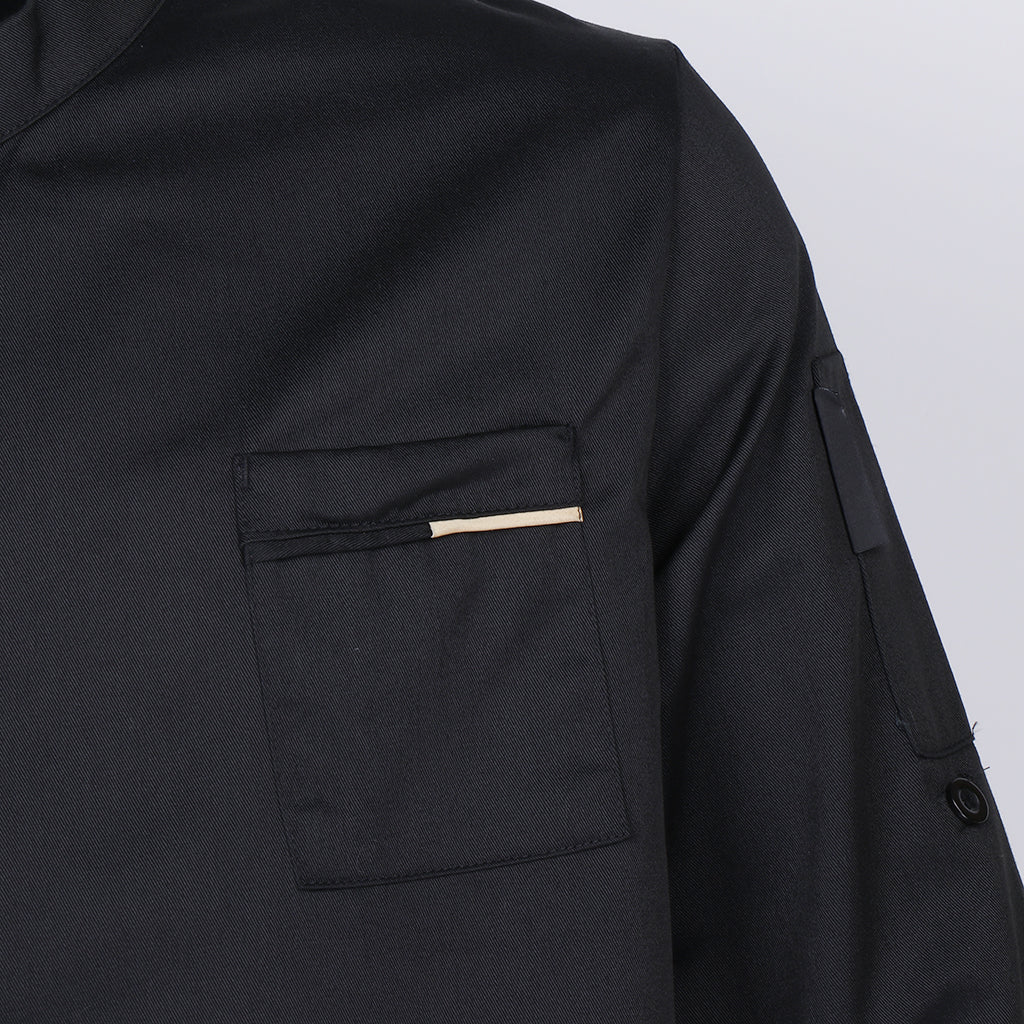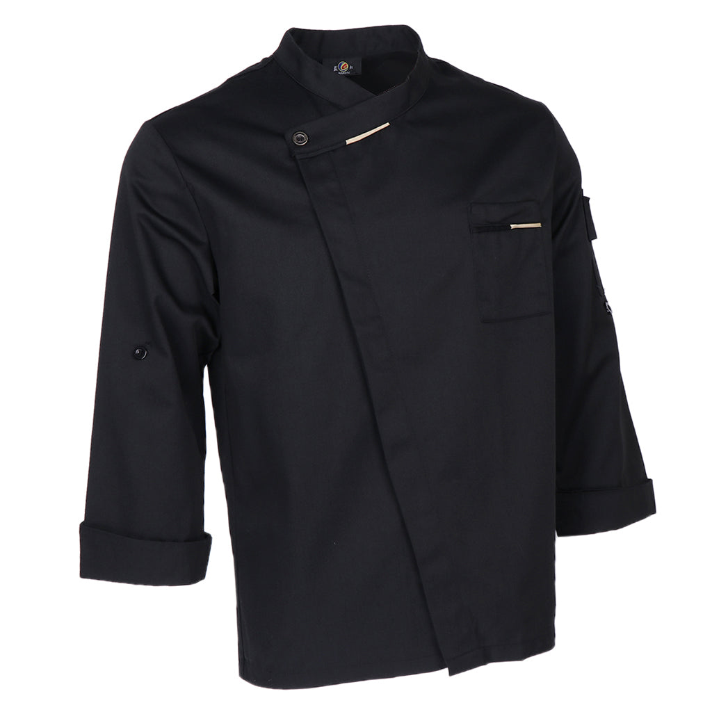 Solid color, single-breasted and long sleeves chef shirt, having left shoulder pockets and left breast pockets, mandarin collar.