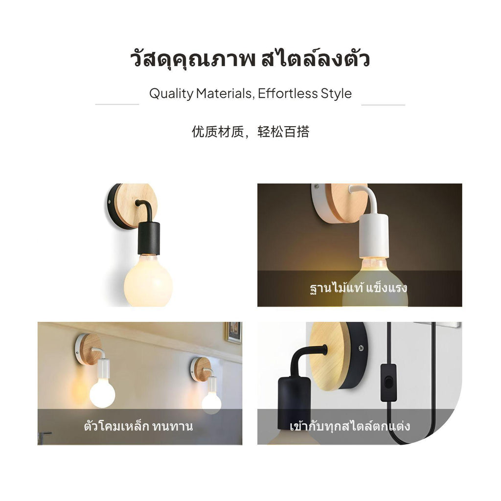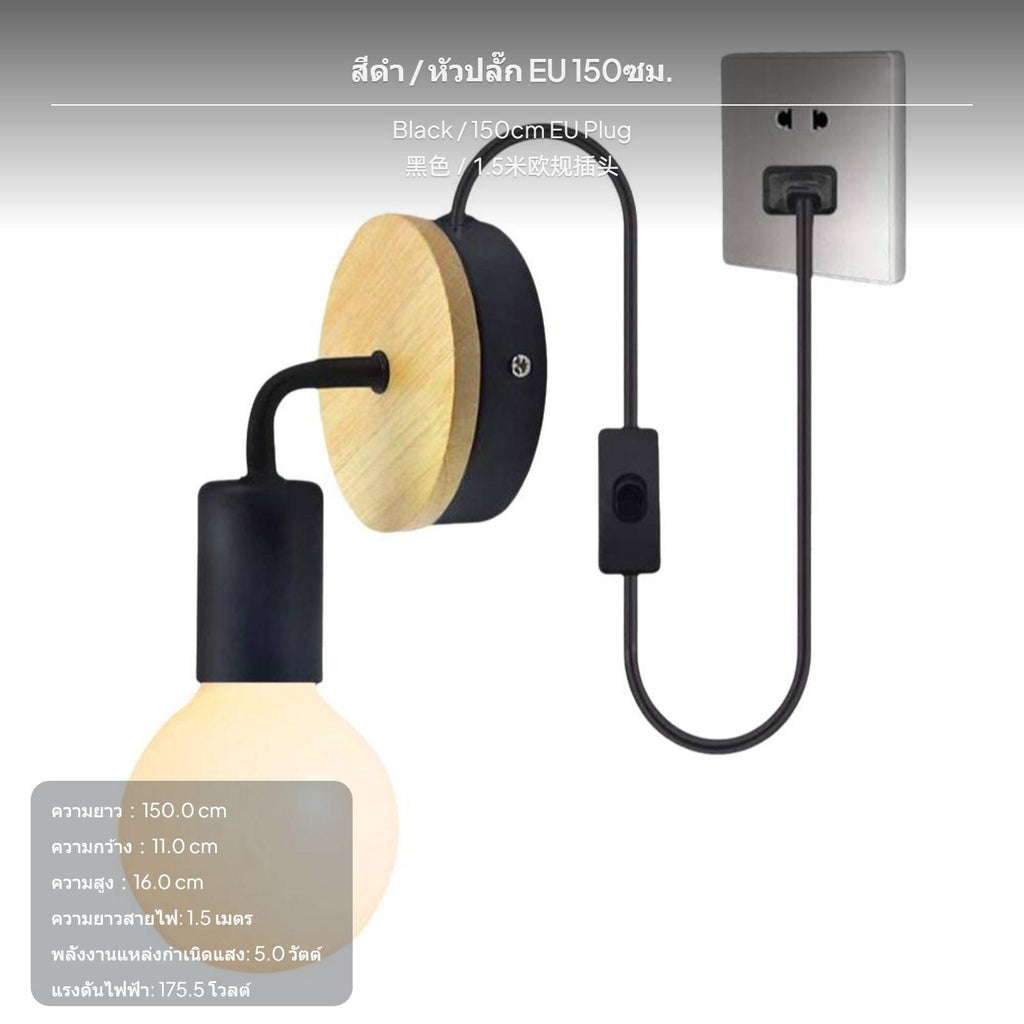 โคมไฟติดผนังสไตล์นอร์ดิก, เหล็ก+ไม้, โคมไฟข้างเตียง, โคมไฟ light-emitting diode, ติดตั้งง่าย, สำหรับห้องนอน/ห้องน้ำ/ทางเดิน Black 150cm EU Plug