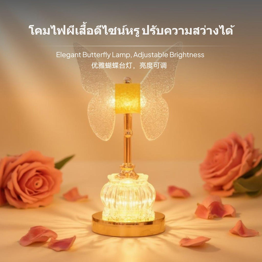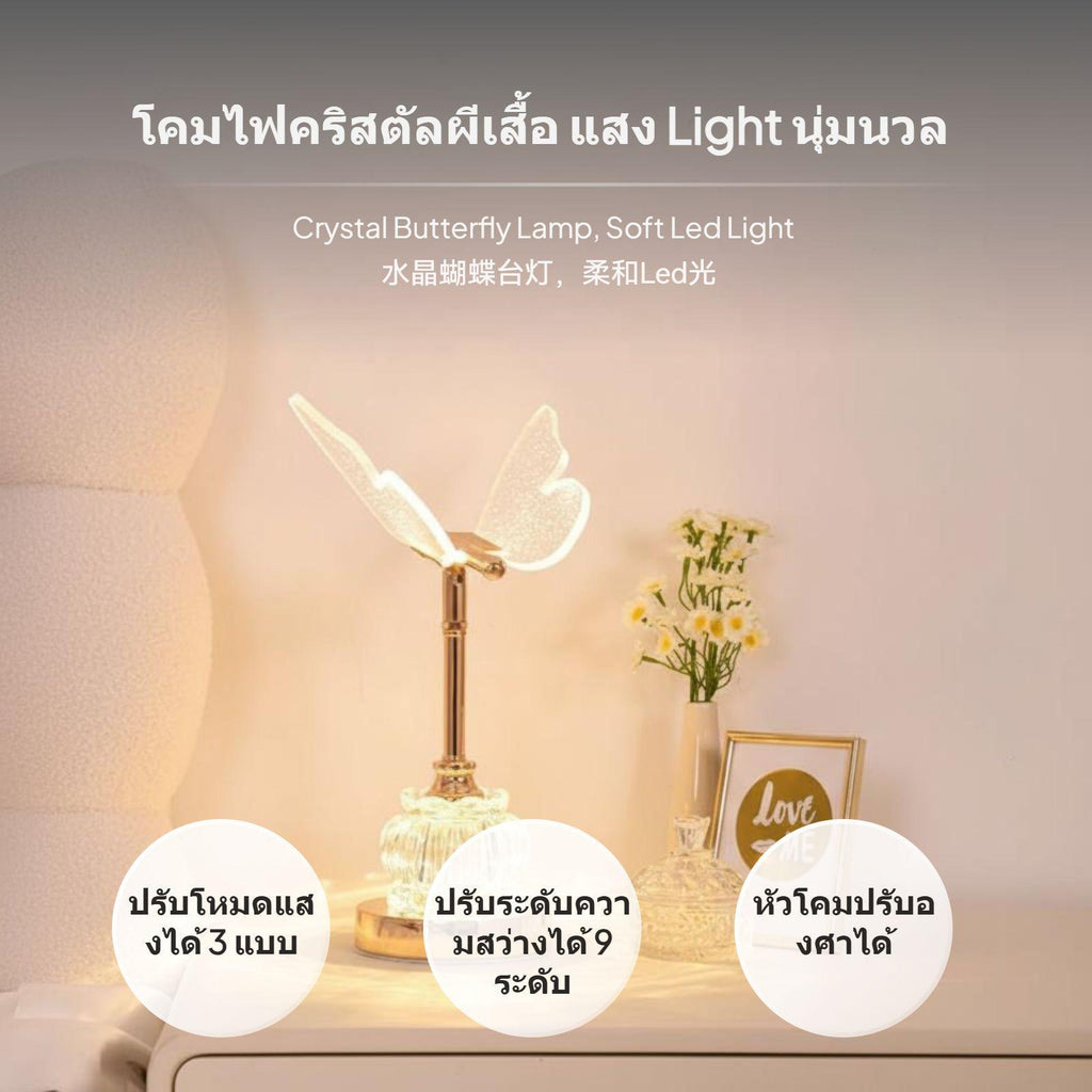 【โคมไฟตั้งโต๊ะคริสตัล light-emitting diode หัวเตียง】โคมไฟตั้งโต๊ะคริสตัลดีไซน์รูปผีเสื้อสุดหรูหรา เหมาะสำหรับตกแต่งห้องนอนและสร้างบรรยากาศโรแมนติก พร้อมฟังก์ชันปรับระดับแสงได้ 9 ระดับและโหมดไฟ 3 แบบ ใช้งานได้หลากหลายทั้งอ่านหนังสือและตกแต่งห้อง.【วัสดุคุณภาพสูงและดีไซน์หรูหรา】ตัวโคมไฟผลิตจากแก้วคริสตัลใสและเหล็กชุบโครเมียม แข็งแรงทนทาน ฐานหนาพร้อมแผ่นกันลื่น วางได้มั่นคงและปลอดภัย.【ปรับระดับแสงและโหมดไฟได้】รองรับการปรับความสว่าง 9 ระดับและเลือกโหมดไฟได้ 3 แบบ (ไฟบน, ไฟล่าง, ไฟทั้งตัว) ตอบโจทย์ทุกความต้องการแสงสว่างและบรรยากาศ.【ป้องกันดวงตาและใช้งานง่าย】ใช้หลอดไฟ light-emitting diode ที่ให้แสงนุ่มนวล ไม่แสบตา เหมาะสำหรับอ่านหนังสือหรือใช้งานกลางคืน ควบคุมด้วยปุ่มกด ใช้งานสะดวก.【เหมาะสำหรับหลายโอกาสและเป็นของขวัญ】เหมาะสำหรับวางข้างเตียง, โต๊ะทำงาน, ตกแต่งห้อง, หรือเป็นของขวัญวันเกิดและเทศกาล เพิ่มความหรูหราให้ทุกพื้นที่.Specification: