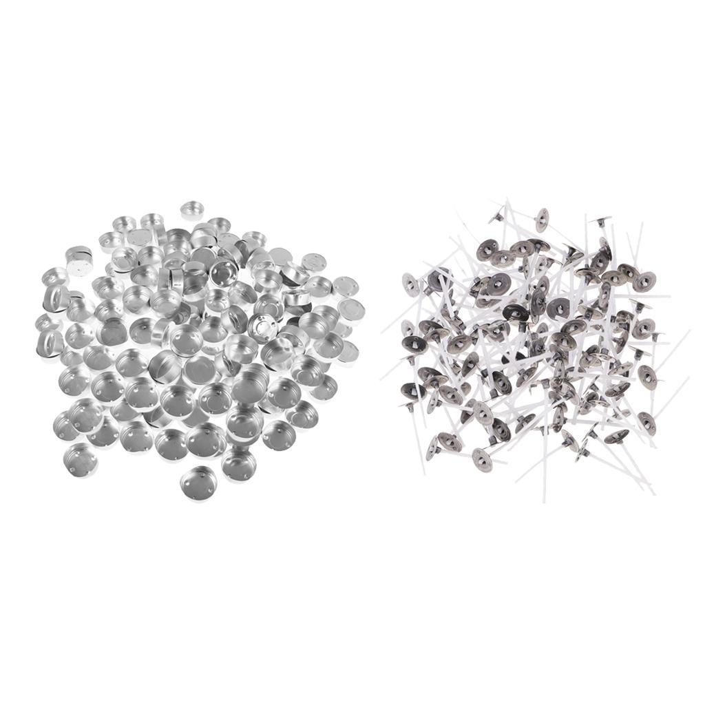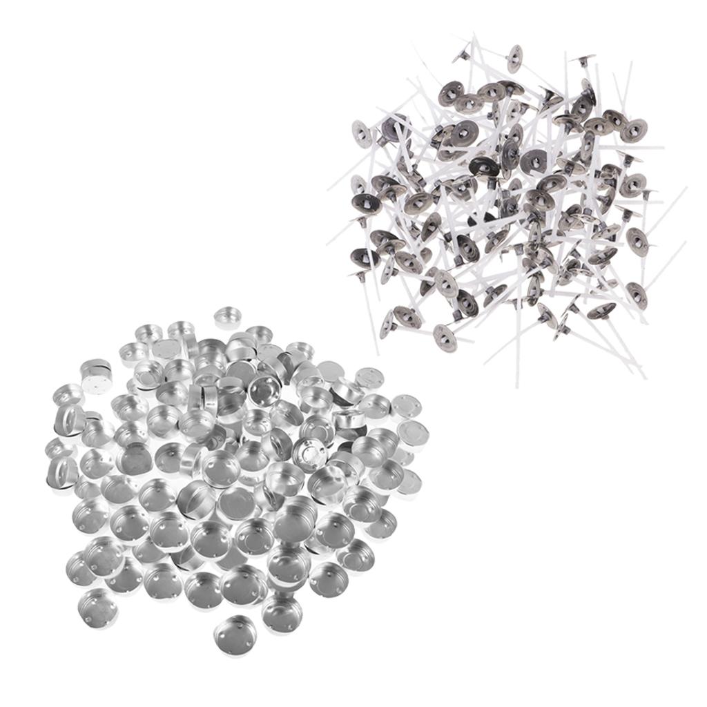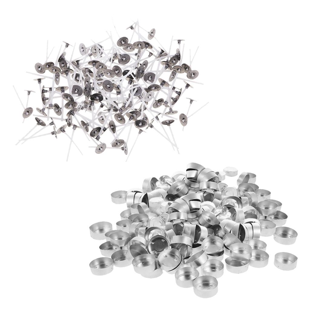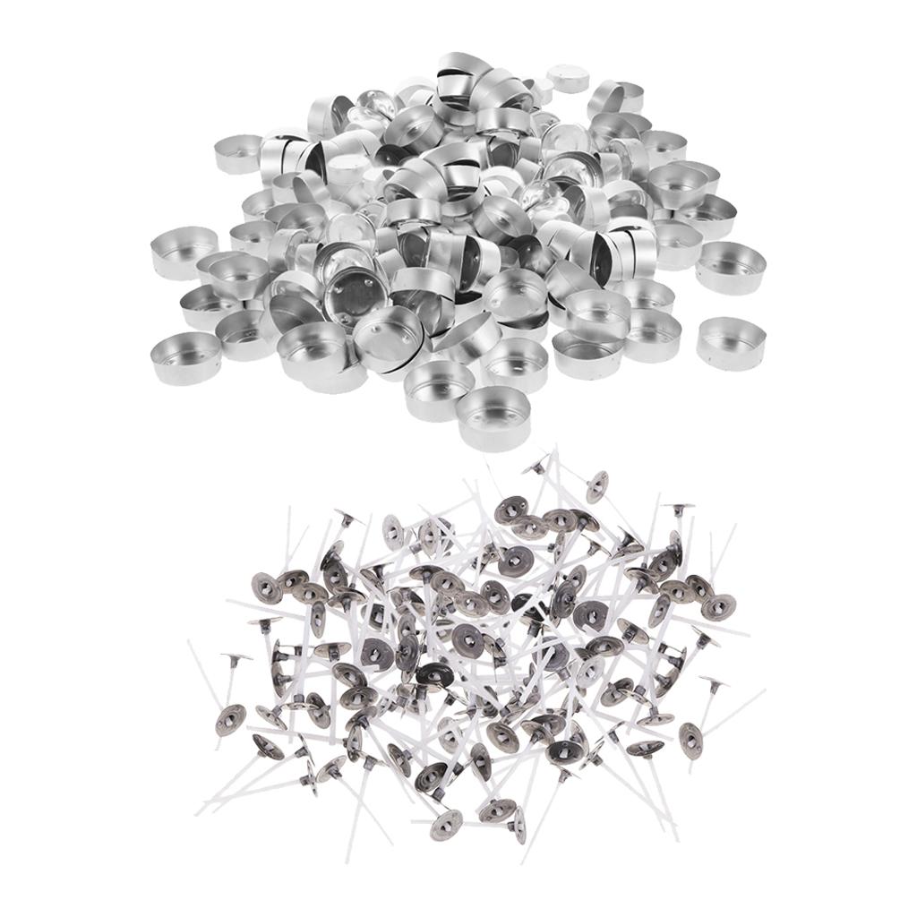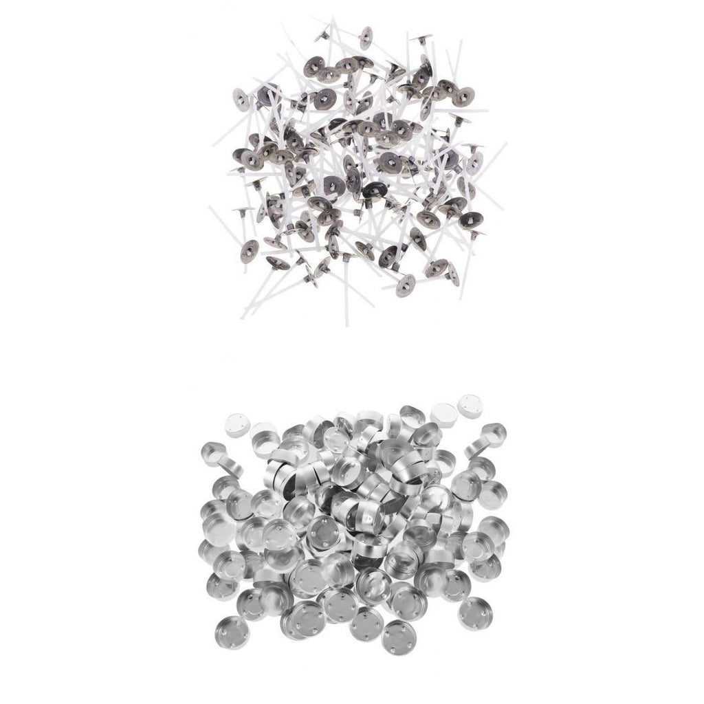 Package comes with 200pcs tealight metal straight flange candle container cups and 200pcs pre-waxed and tabbed cotton candle wicks (3cm)
