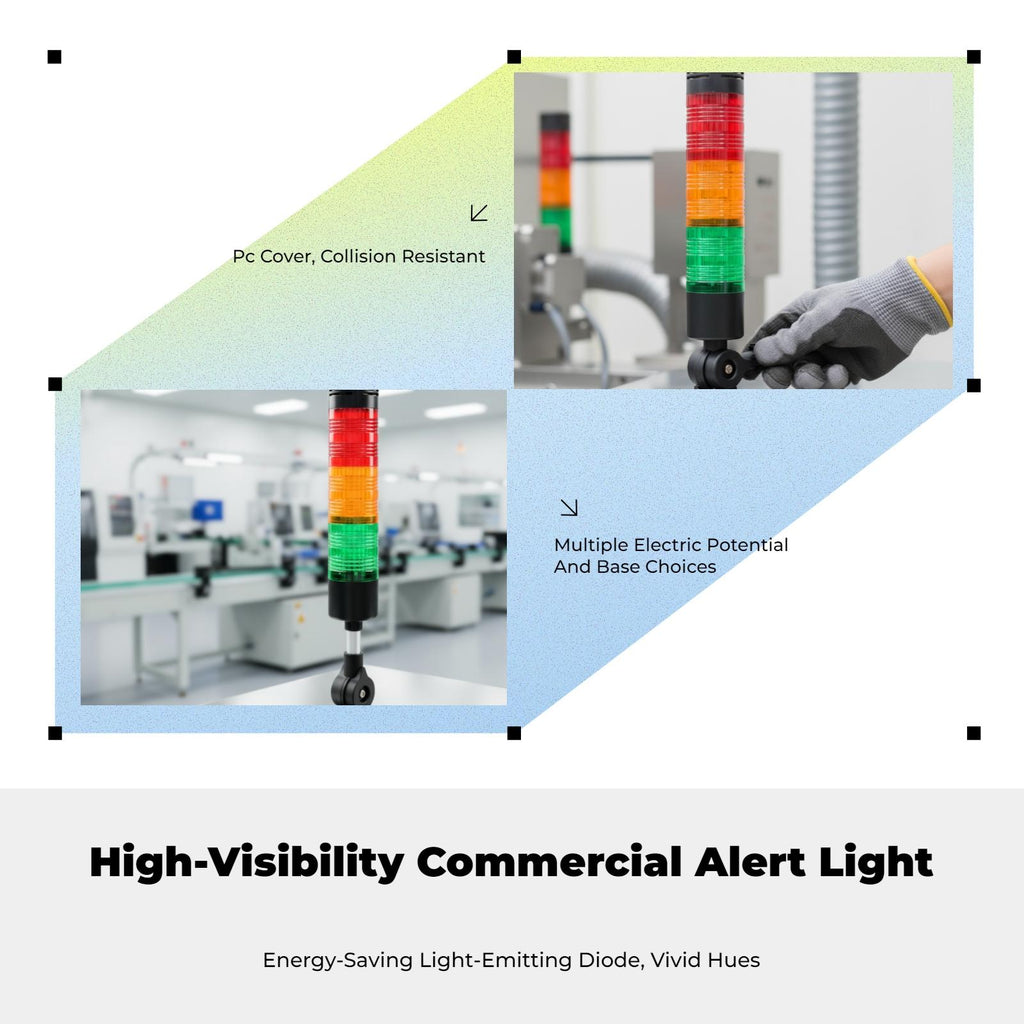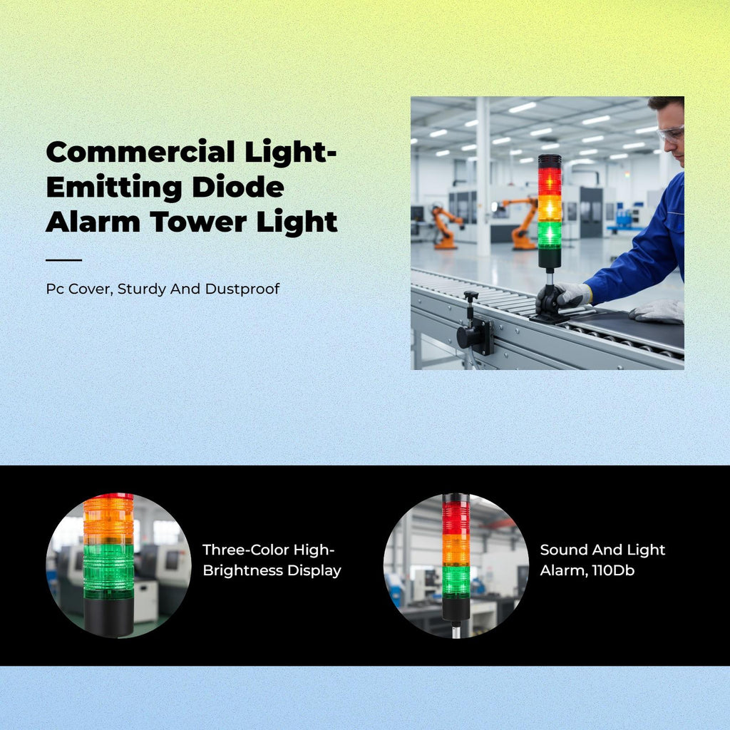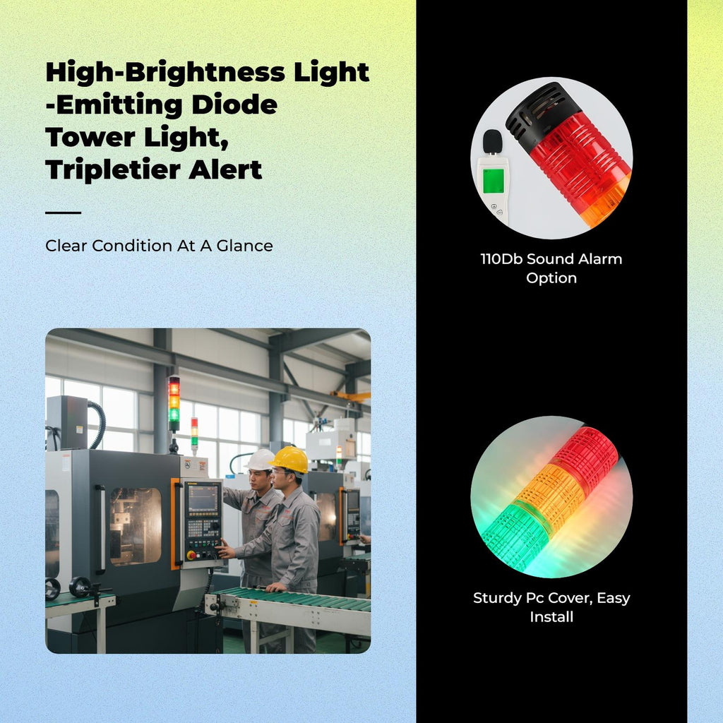 [Multitier light-emitting diode Alert Tower for Manufacturing ] This 3-tier light-emitting diode warning light delivers clear red, green, and yellow indications for machine tools, injection molding machines, and manufacturing equipment, ensuring effective fault indication and [sturdy PC Material Base] Built from sturdy PC material and featuring an base, this tower light offers dustproof performance and long reliability for factories, workshops, and assembly lines. [Easy Installation, Versatile Use] Designed for quick setup, it is suitable for workstations, machinery, and production equipment, optimizing and productivity across various manufacturing environments. [Efficient Visual and auditory Alarm] Equipped with bright light-emitting diode lighting and an optional buzzer for clear visual and sound alerts, enabling immediate reaction to equipment faults and warnings. [Energy-Saving 24V DC Power] Operates on 24V DC, providing stable and energy-efficient performance for continuous operation in manufacturing settings.Specification: