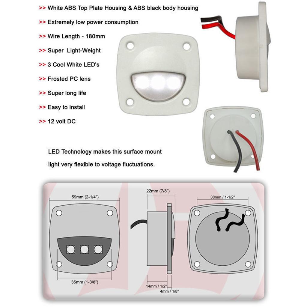 The tough ABS sleek white housing is 2-1/4" x 2-1/4" and has 3 cool bright white LEDs.