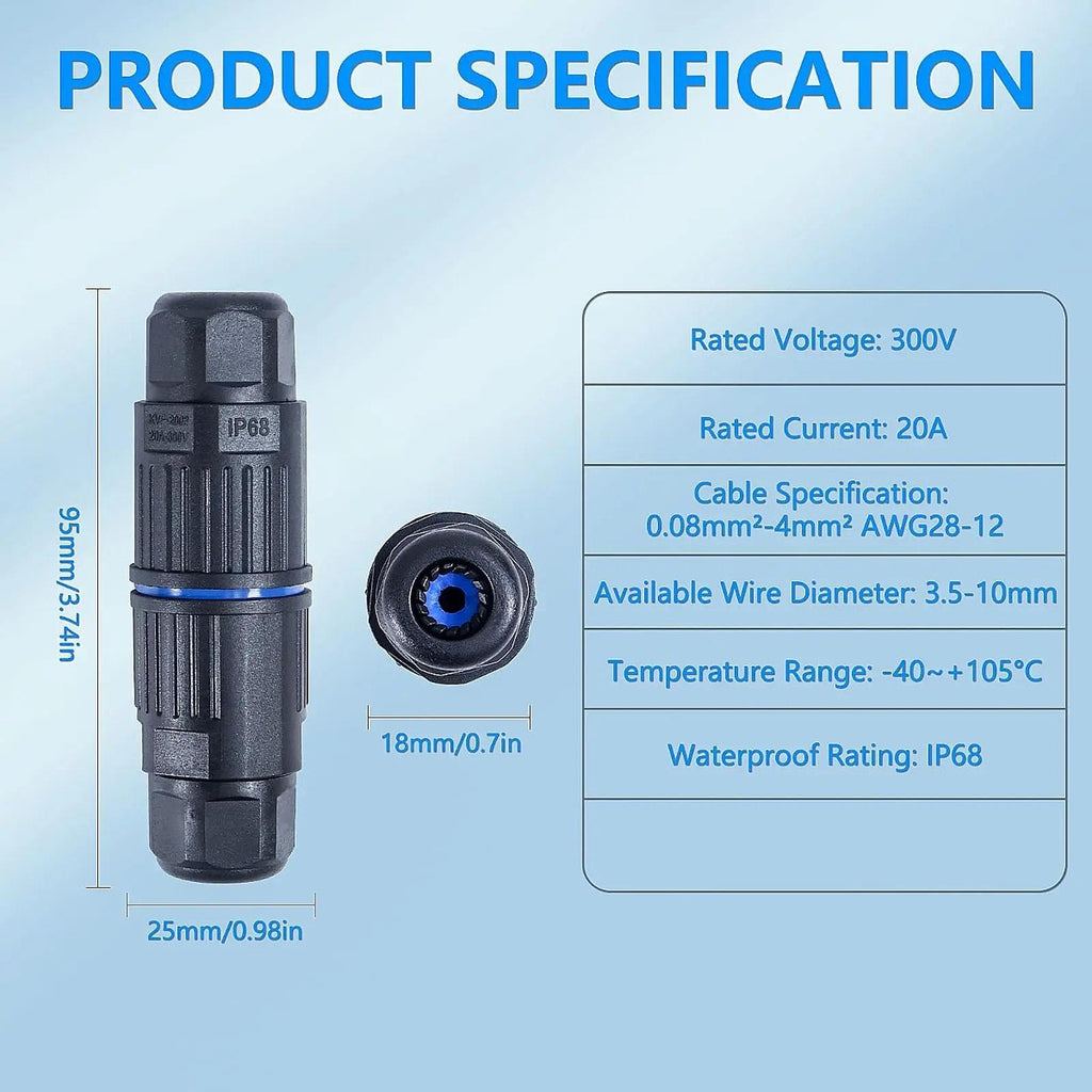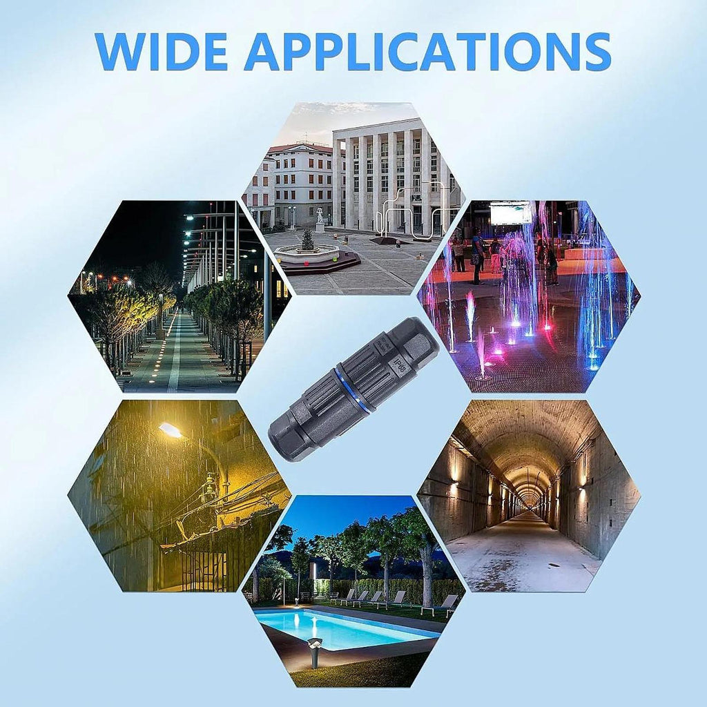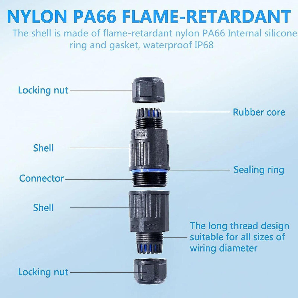 【Enhanced IP68 Waterproof Design】: This outdoor wiring connector features a quality PC shell, silicone sealing ring, and nylon elastic wiring port. It is upgraded to be waterproof, fireproof, dustproof, and impact resistant, making it suitable for use in both sunny and rainy conditions