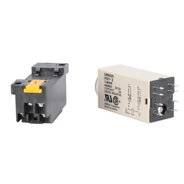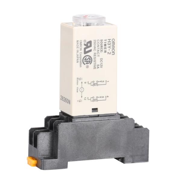 H3Y-2 delay timer with mounting base. This delay timer relay measures approx. 2.2 inch long, 1.1 inch wide and 0.8 inch thick. Operated with DC 12V voltage, 5A contact capacity, this delay timer offers a 0-30 second time range.