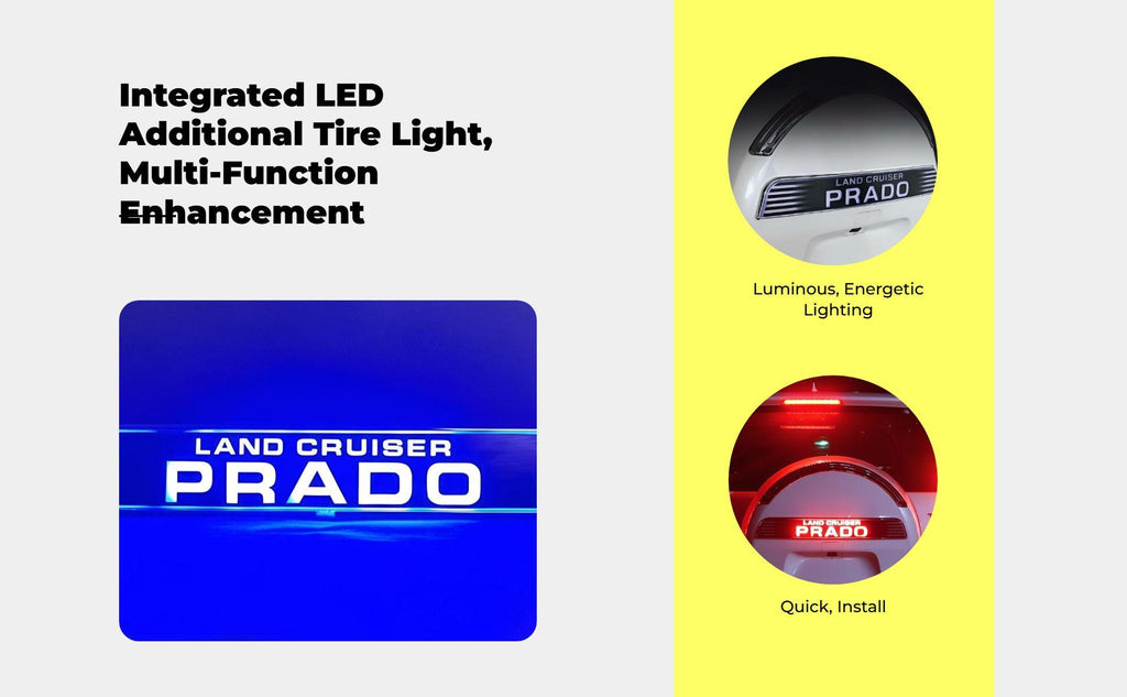 [additional Tire Cover with light-emitting diode Tailgate Lighting] Enhance your vehicle’s appearance and with this waterproof additional tire cover featuring integrated light-emitting diode tailgate lighting, designed for Prado design S from 2010 to 2021. [High-Quality and sturdy Material] Crafted with materials and light-emitting diode components, this cover awayers protection against torrential rain, mud, and, ensuring long performance across different terrains. [Multi-Functional for Outdoor exploration] perfect for camping, path trips, and awayhighway exploration, this cover provides dependable lighting for nighttime loading and unloading, emergency situations, and common travel. [Easy Installation and Userconvenient Design] Engineered for quick, stable installation, this cover matches perfectly on the rear compartment and extra tire, enhancing convenience and the driving experience. [High Brightness and dependable Performance] Featuring imported light-emitting diode chips and a heat dissipation base, the lighting emits 1200 lumens of cool, clear brightness for visibility.