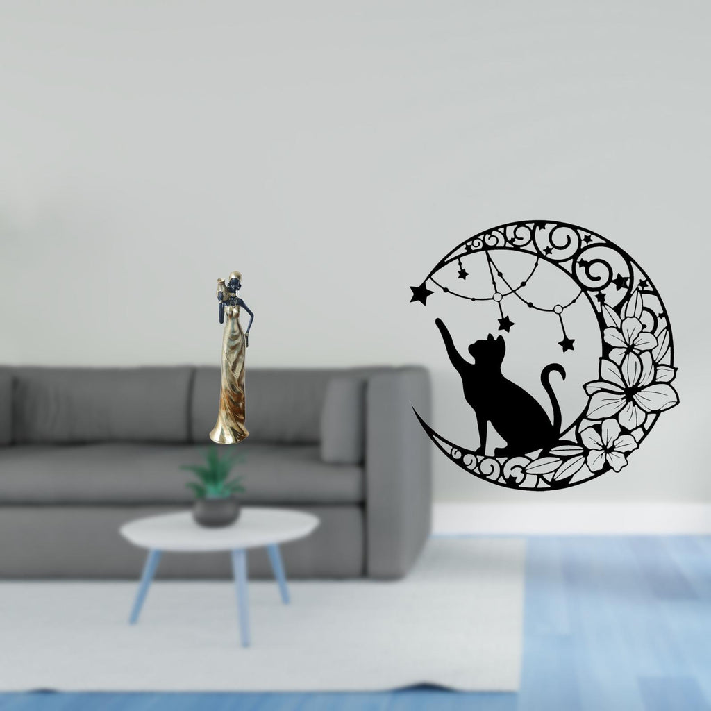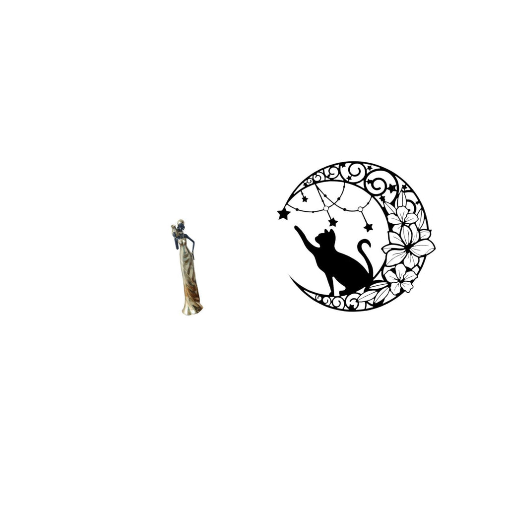 African Tribal Lady Sculpture with Metal Cat Moon Art Figurine Lightweight Decorative Home Decor for Hotels and Cat Lover Gifts Wall