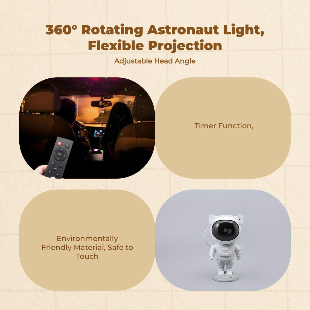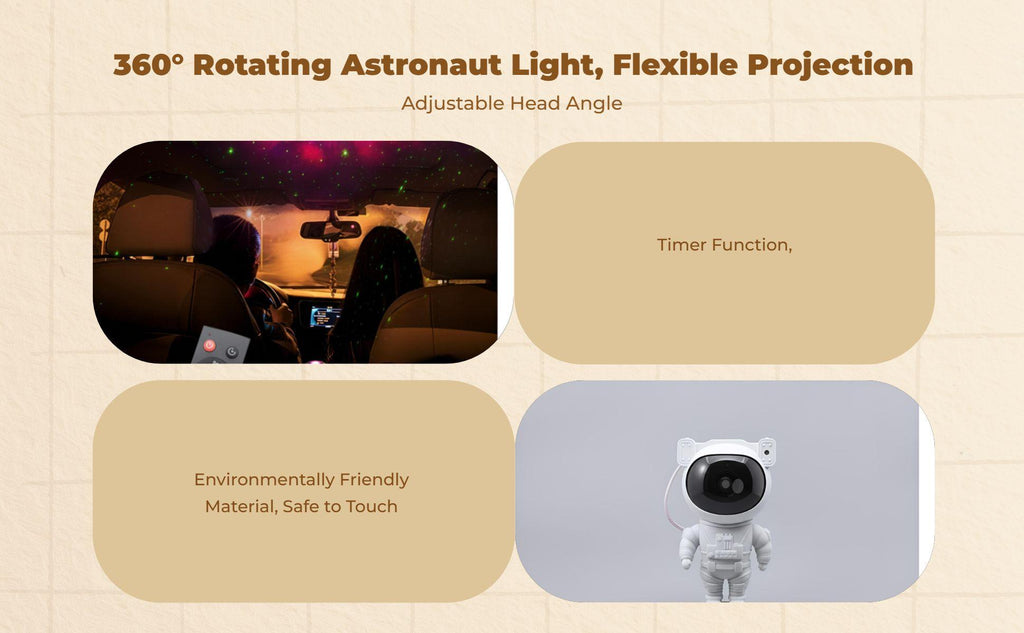 【Astronaut Celestial Projector Creates a Magical Atmosphere】Transform your bedroom or your child’s room with this astronaut celestial projector, featuring nebula effects and northern lightsdesign lighting for an immersive experience. Perfect for birthdays, holidays, and special gatherings. 【 Speaker with Neutral Noise Function】The built-in 5.1 speaker and 8 neutral noise choices provide soothing sounds for relaxation, making it an choice for bedrooms, game rooms, and nurseries. 【Remote & Timer Function for Easy Control】Conveniently control with the remote or through the app, adjust brightness, and set customizable timers to fit your mood and schedule. 【360° Adjustable Head Angle & Multiple Lighting Modes】The astronaut’s flexible design allows for a 360° adjustable head and various lighting modes, so you can create a personalized atmosphere for any occasion. 【Energy-Efficient, Portable, and Sleek】Made from PC+PVC, this energy-saving light features a universal connector, sleek design, and portability—perfect for home, dormitory, or travel use.