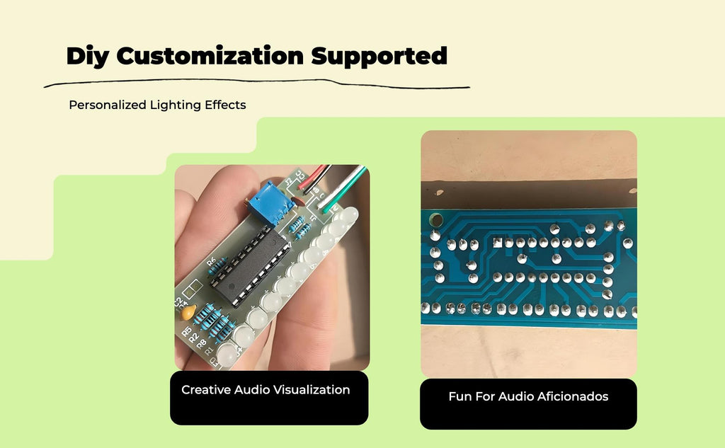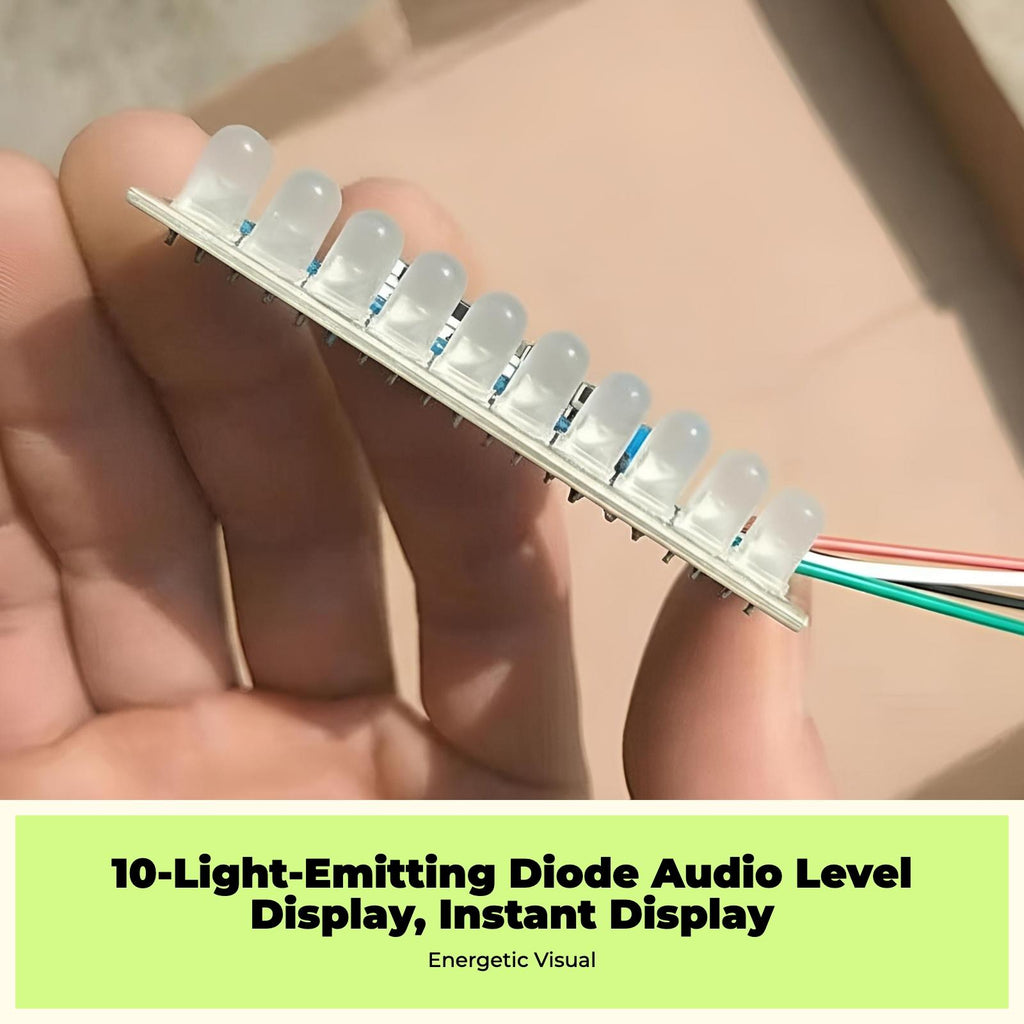 [Adaptable Audio Level Display for Multiple Scenarios] This light-emitting diode audio level display features a 10-band VU meter, offering clear and dynamic visualization of volume and rhythm for audio amplifiers, home theaters, and recording studios. [High-Quality and Practical DIY Kit] Equipped with sensitive audio inputs and adjustable sensitivity, this kit is suitable for DIY audio projects, electronic training, and hands-on assembly, delivering high fidelity and ease of use. [Multi-Device Compatibility and Easy Installation] Compatible with computers, car audio, PA systems, and more, this display supports various wiring methods and input levels, making it perfect for versatile audio setups. [Distinctive light-emitting diode Display for Enhanced Experience] The light-emitting diode volume display provides instant range and maximum indication, adding a visual aspect to music production, gaming, and active streaming environments. [dependable Components and Comprehensive Package] Includes a PCB board, 3mm light-emitting diodes in green, yellow, and red, plus all necessary electronic components for assembly, supporting both educational and practical uses.Specification: