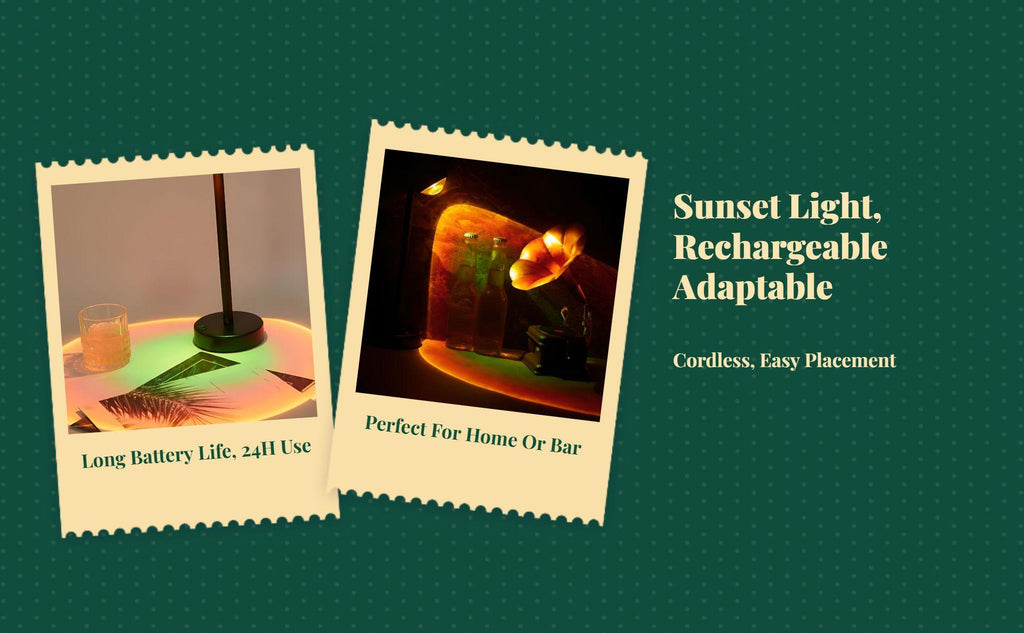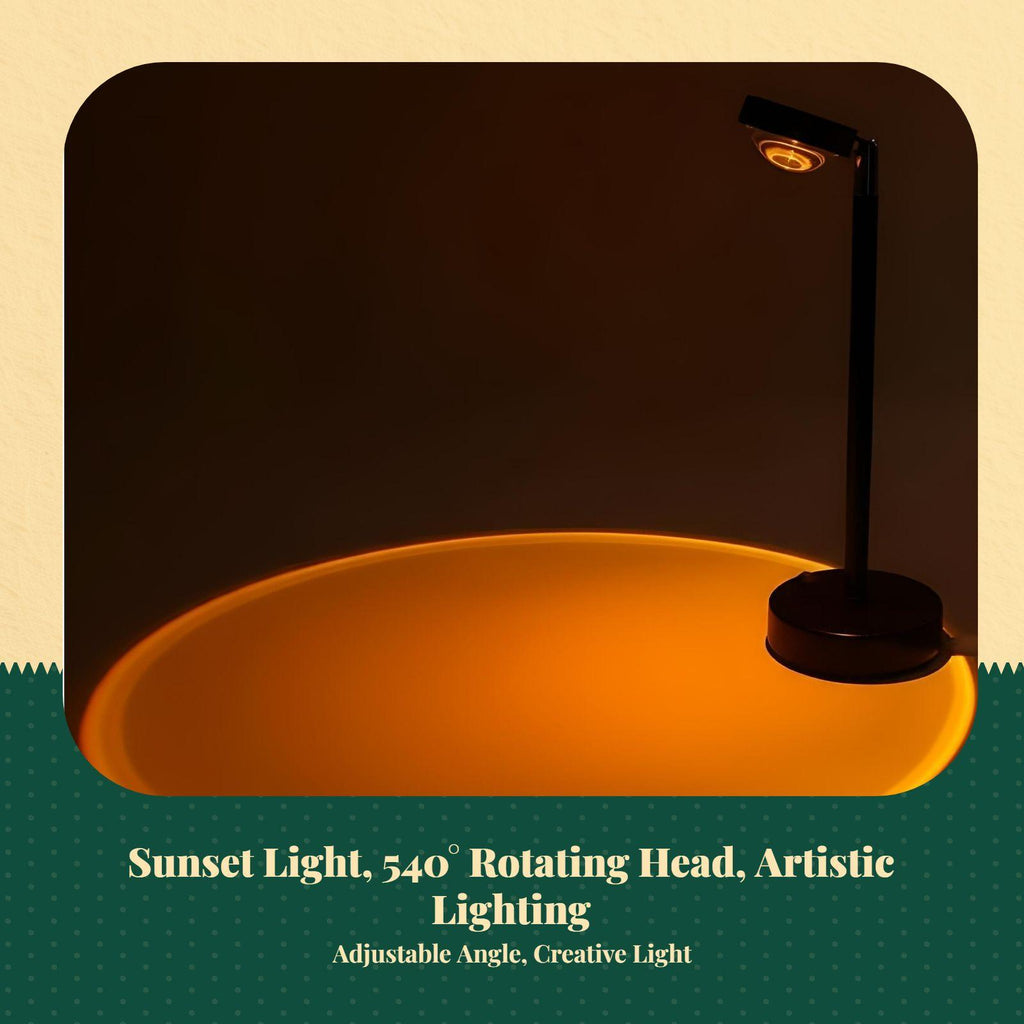 [Adaptable Mood Lighting for Lounges and Restaurants] This rechargeable sunset light projector creates a captivating atmosphere for lounges, restaurants, and parties, offering multi-color ambient lighting to enhance any occasion. [Modern light-emitting diode Design with Multiple Color Choices] Featuring a sleek aluminum construction, this table lamp offers flexible lighting with RGB+W light-emitting diode bulbs and easy button controls for various settings. [Portable and Space-Saving] small and lightweight, this lamp is easy to move and accommodates perfectly on desktops, bedside tables, or kitchen islands, making it perfect for home décor and recreation. [360-Degree Rotation and Dimmable Function] Enjoy even lighting and adjustable brightness with a 360° rotatable head and dimmable features, suitable for photography, streaming, and recording. [Rechargeable and sturdy] Made with high-quality materials, this lamp is rechargeable via a charging port, ensuring long use and practical convenience for both indoor and outdoor settings.