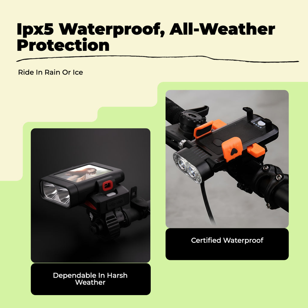【Extremely Bright Bike Headlight for Night Riding】This port rechargeable bike headlight provides powerful lighting for trail cycling, street cycling, and all-terrain adventures, ensuring your safety when riding in low-light conditions.【Waterproof and robust Design】With IPX5 waterproof classification and sturdy aluminum alloy construction, this front light withstands rain and splashes, making it perfect for use in various weather conditions.【Long Battery Life & Fast Charging】Equipped with a high-power chip and port-C fast charging, this bike headlight offers extended usage time and rapid recharging, delivering uninterrupted performance on your rides.【Easy Installation & Universal Fit】The included bracket enables quick and easy installation on most bikes, including trail and street bike type, ensuring a stable and stable fit.【Versatile 4-in-1 Functionality】Combining headlight, flashlight, bracket, and port charging capabilities, this bike light is a practical and cost-effective solution for frequent commuting and outdoor cycling.