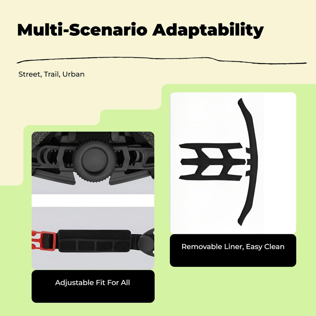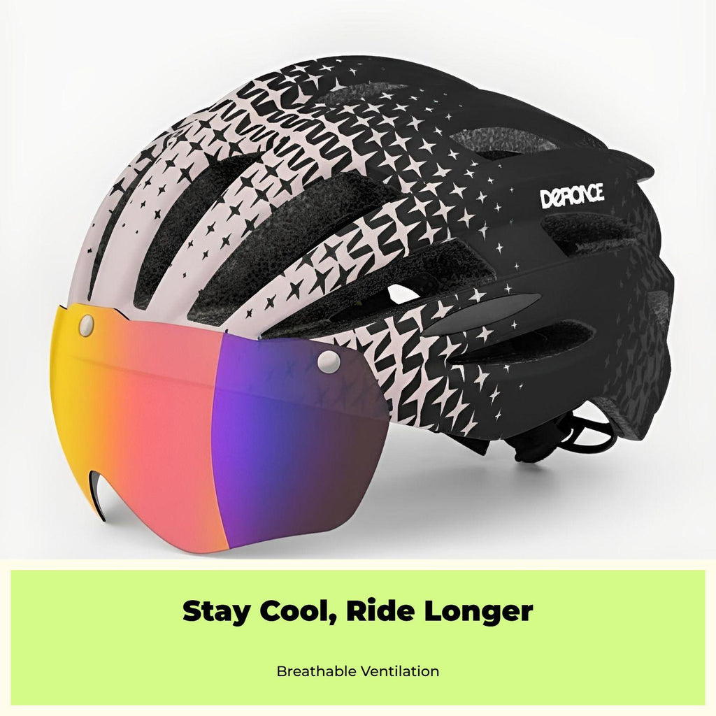 【Ventilated Bike Helmet with Rechargeable Lighting System】This cycling helmet features optimal ventilation and a built-in rechargeable light-emitting diode rear light, boosting security and visibility for both trail and street cycling.【Detachable Goggles and Sun Visor for Versatile Protection】Equipped with removable goggles and a sun visor, this helmet protects you from sunlight and debris, offering additional protection and comfort for both men and women riders.【Adjustable Fit for Personalized Comfort】The adjustable dial fit system and straps ensure a customized fit for adults, making it suitable for various head sizes and comfortable during long rides.【Lightweight and sturdy Construction】Crafted with dense foam and a robust, collisionresistant shell, this helmet delivers dependable head protection while remaining lightweight for comfortable wear during outdoor activities.【perfect for Multiple Cycling Scenarios】Perfect for trail biking, street cycling, urban commuting, and outdoor adventures, this helmet is designed for men and women, offering both security and elegance.Specification: