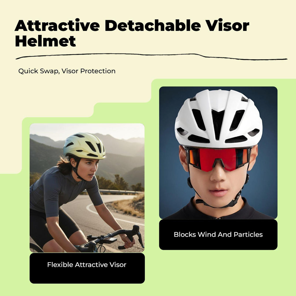 【Adaptable Bike Helmet for Street and Terrain】This cycling helmet is designed for both urban and trailpath riding, trailering dependable safety protection and comfort for adult men and women during commuting or recreational cycling.【Breathable and Lightweight Design】Featuring multiple air vents and a lightweight build, this helmet provides superb ventilation and reduces fatigue on long rides, making it perfect for urban commutes and trail excursions.【Snap-On Detachable Goggles】Equipped with snap-on goggles, this helmet delivers windproof, dustproof, and sun protection, effectively safeguarding your eyes and enhancing your riding experience in diverse conditions.【Adjustable Fit for Universal Adult Use】The adjustable dial, straps, and soft chin pad allow for a customized, snug-fit suitable for riders aged 14 and over, ensuring comfort for both men and women.【Sturdy and collision-Absorbing Materials】Crafted with an ABS shell and dense foam, this helmet trailers dependable shock absorption and enhanced durability, promoting overall safety throughout your cycling outing.