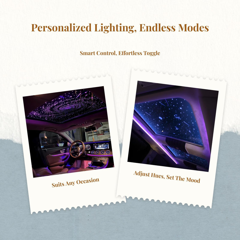 【Car Interior Atmospheric Light for illuminatery Ceiling】Create a romantic and immersive mood in your vehicle with this fiberfiber illuminate ceiling light, perfect for parties, night drives, and enhancing your car's interior design.【 App Control & Music Sync】Easily adjust hues and brightness through app control, with sound-activated features that sync the lighting effects to your favorite music for a dynamic experience.【Universal Fit & Easy Installation】This atmospheric light kit is designed to fit universally, with flexible and usersimple installation for any car ceiling or panoramic sunroof.【Upgraded Beads sturdy Materials】Equipped with upgraded beads and reinforced materials for gentle lighting, lower energy consumption, and longer lifespan.【Versatile Decorative Lighting】perfect for car dashboards, center consoles, and ceilings, this lighting adds elegance and atmosphere to any vehicle interior.Specification: