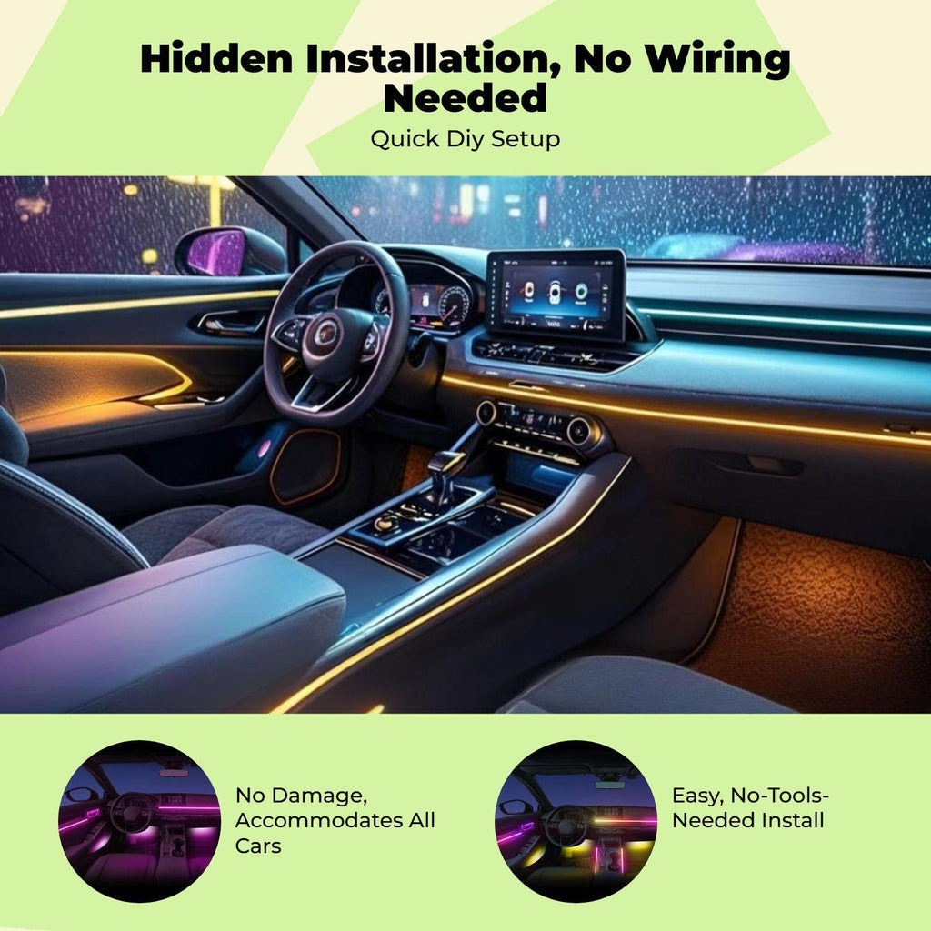 【Car Mood Lighting Kit Enhances Interior Atmosphere】enhance your vehicle with this light-emitting diode strip mood lighting kit, designed for dashboards, door panels, and footwells. Experience customizable hues and lighting modes for a stylish driving experience.【cordless App Control for Easy Customization】Effortlessly adjust brightness, hues, and lighting effects with cordless app control or remote control. Flexible installation accommodates most cars, sedans, SUVs, and pickups.【High-Quality and resilient Materials】Crafted from PMMA fiber light material, this kit provides longsustained functionality and secure-use during frequent drives and nighttime trips.【Universal Fit and Easy Installation】double port power and additionallong light-emitting diode strips enable straightforward installation in any car or sedan, meeting diverse interior decoration needs.【Music Sync and Multiple Lighting Modes】Enjoy music harmonization and multiple lighting modes for a dynamic, immersive atmosphere—perfect for upgrading your vehicle's interior on night drives or frequent commutes.Specification: