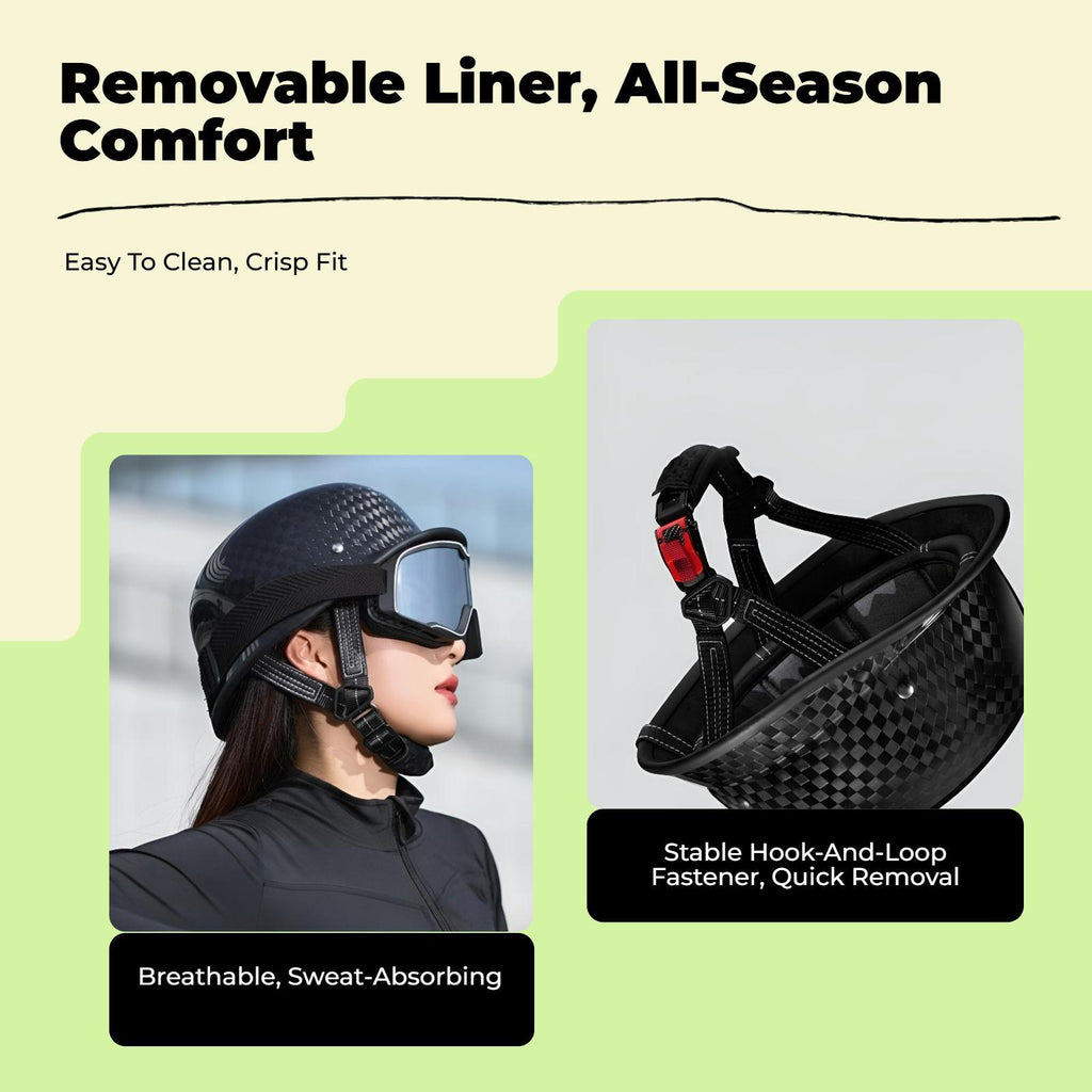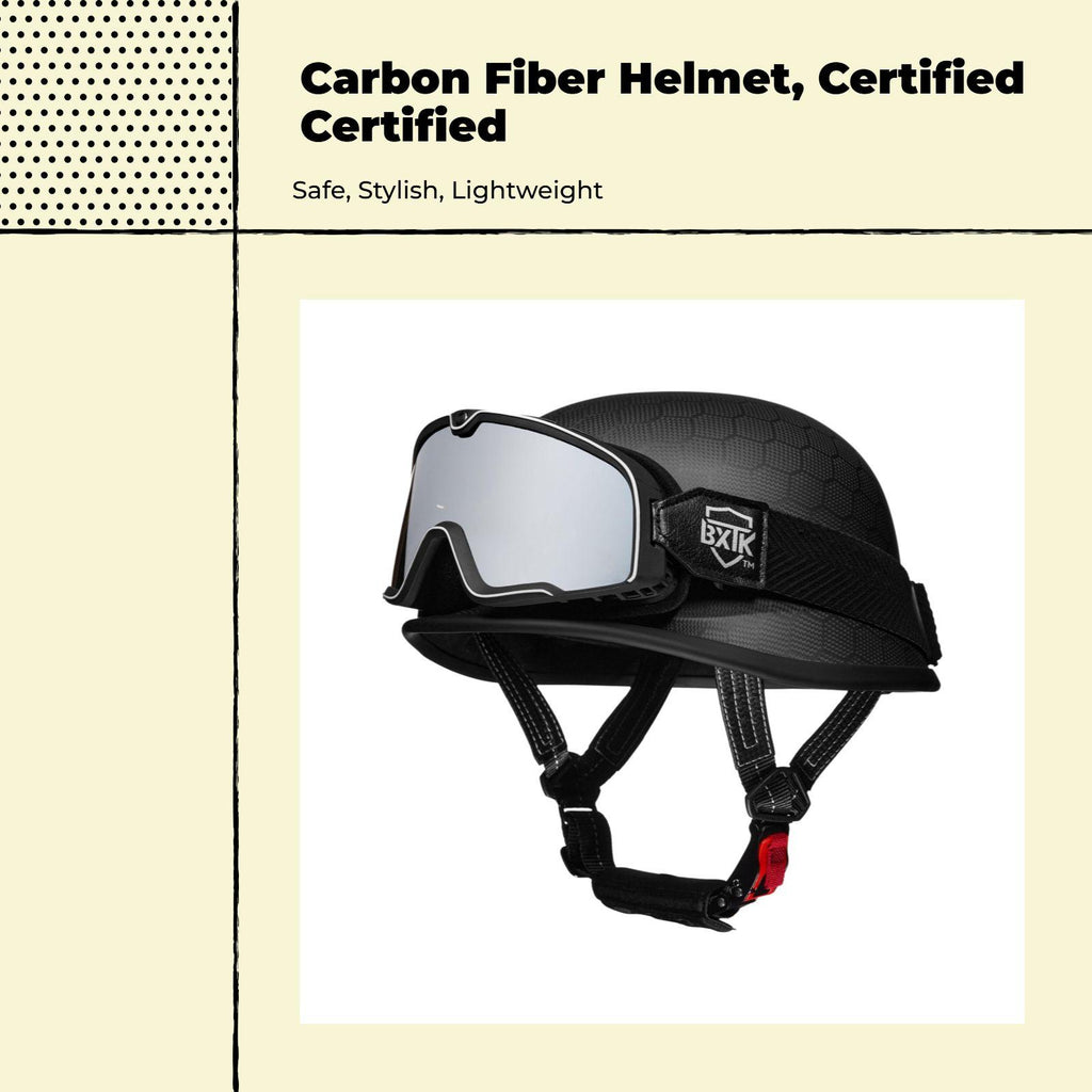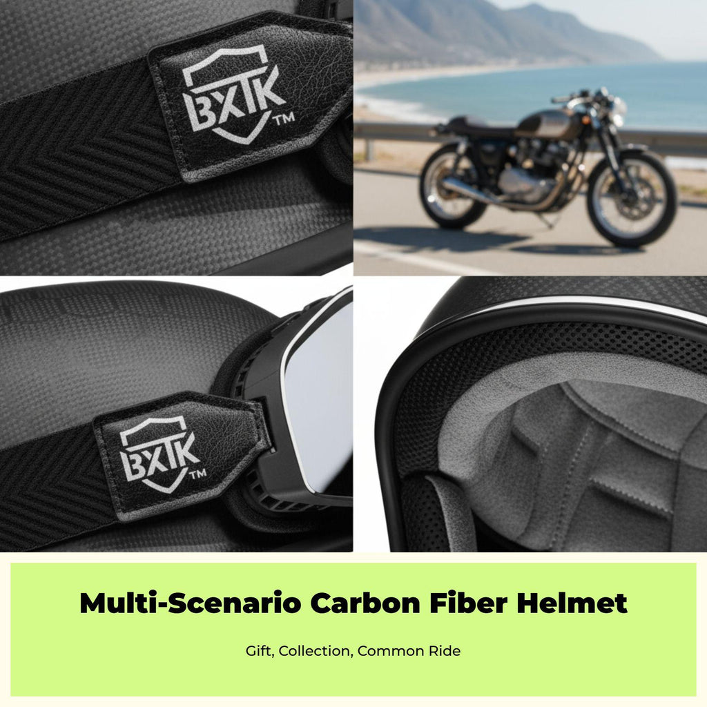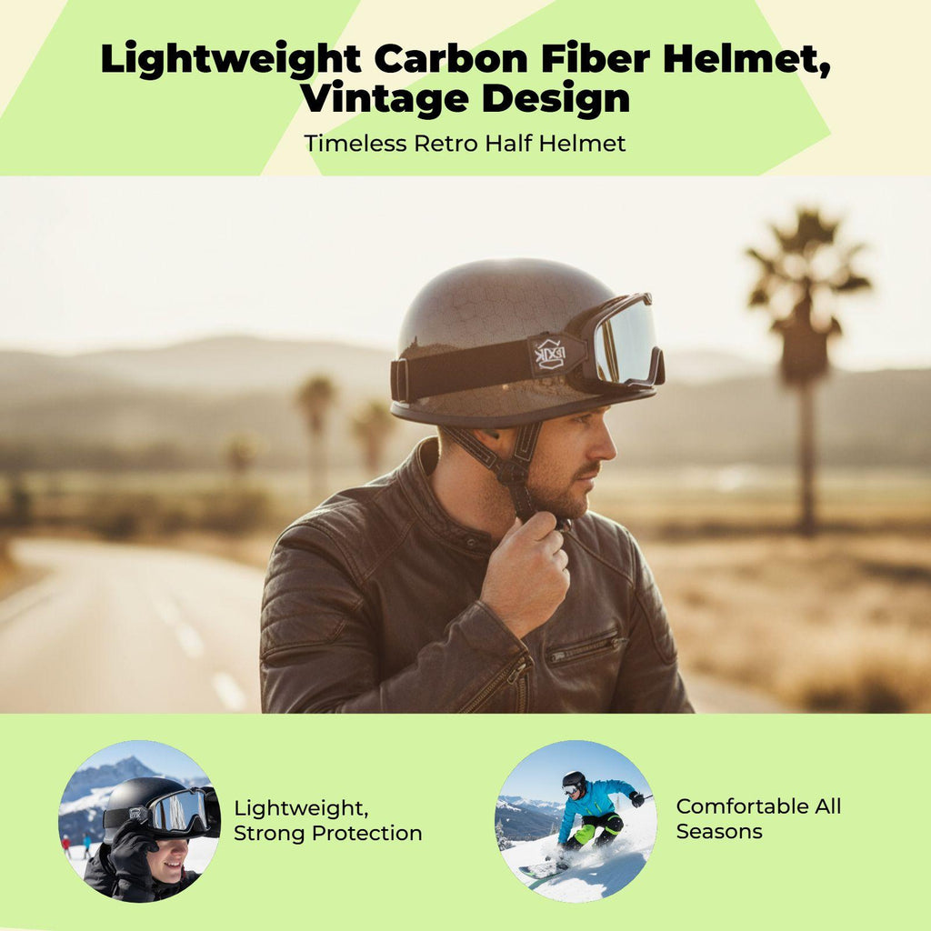 【Lightweight Carbon Fiber Retro Helmet】This carbon fiber motorcycle half helmet features a timeless retro design, perfect for adult riders who value both aesthetic and safety during everyday commutes, highway rides, or urban travel.【Certified Protective Helmet for dependable Safety】The helmet complies with approved protection standards, delivering dependable head protection across various riding situations including scooters, touring bikes, and electric vehicles.【Comfortable and Breathable Interior】Designed with a removable, cleanable expanded polystyrene liner and an upgraded ventilation system, this helmet provides comfort and freshness even on long trips or during hot weather.【Adaptable for All Seasons and Genders】Suitable for both men and women, this versatile helmet is designed for year-round use and offers an adjustable strap for a snug-fit for different head sizes.【sturdy and Practical Choice】Constructed from high-strength carbon fiber, the helmet is lightweight yet resilienceresistant, making it a practical and cost-effective choice for motorcycle riders.Specification: