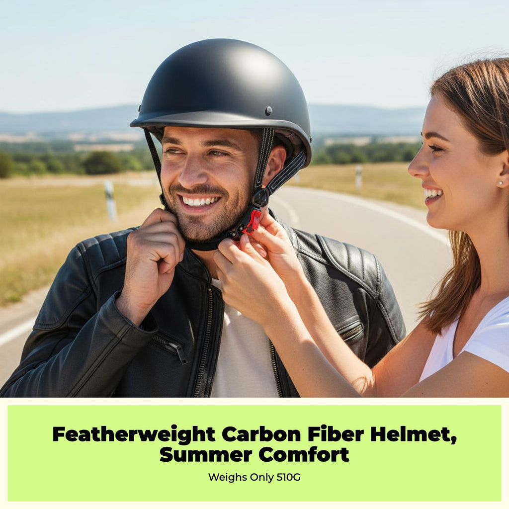 【Lightweight Carbon Fiber Helmet for Summer Riding】This carbon fiber motorcycle helmet boasts a retro open-face design, delivering superb protection and comfort for men and women during summer cruising, commuting, or urban riding.【High-Quality and Sturdy Construction】Crafted from high-strength fiberglass and carbon fiber, this helmet offers dependable collision protection and enduring durability for a wide range of riding situations.【Comfortable and Breathable Interior】Outfitted with soft, breathable inner padding and multiple air vents, the helmet provides superior ventilation and heat dissipation, ensuring you stay cool and comfortable on every ride.【Versatile and Perfect for Various Uses】perfect for motorcycles, scooters, street bikes, and more, this helmet meets the needs of adults looking for both design and safety in their riding equipment.【Easy to Use and Maintain】Designed with a easy-release buckle, adjustable straps, and removable cleanable liners for effortless consistent use and maintenance.
